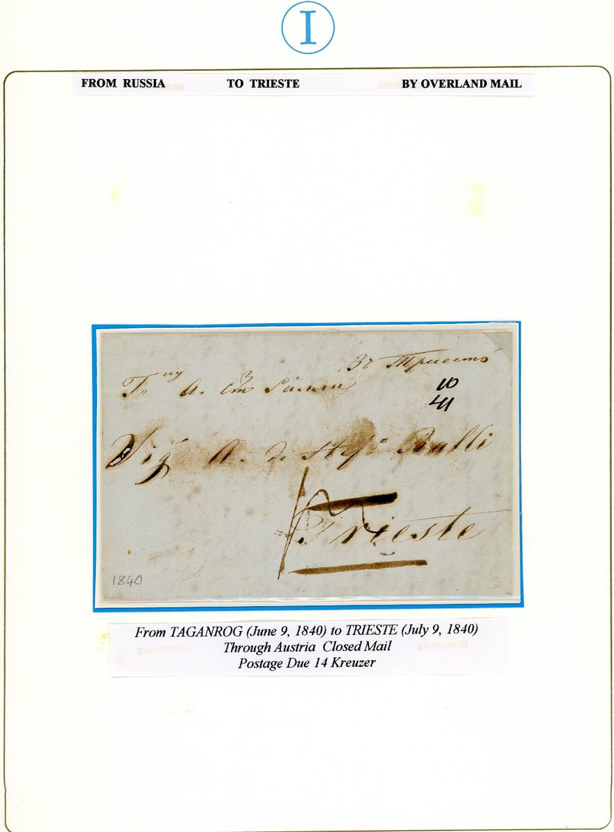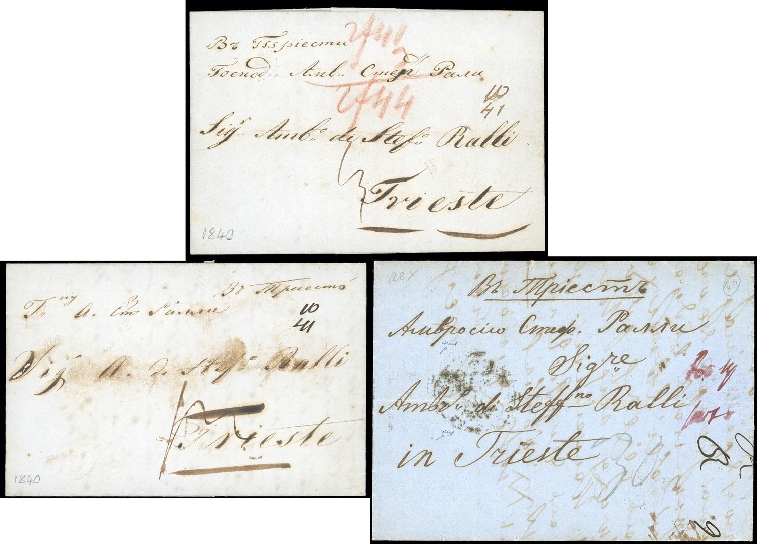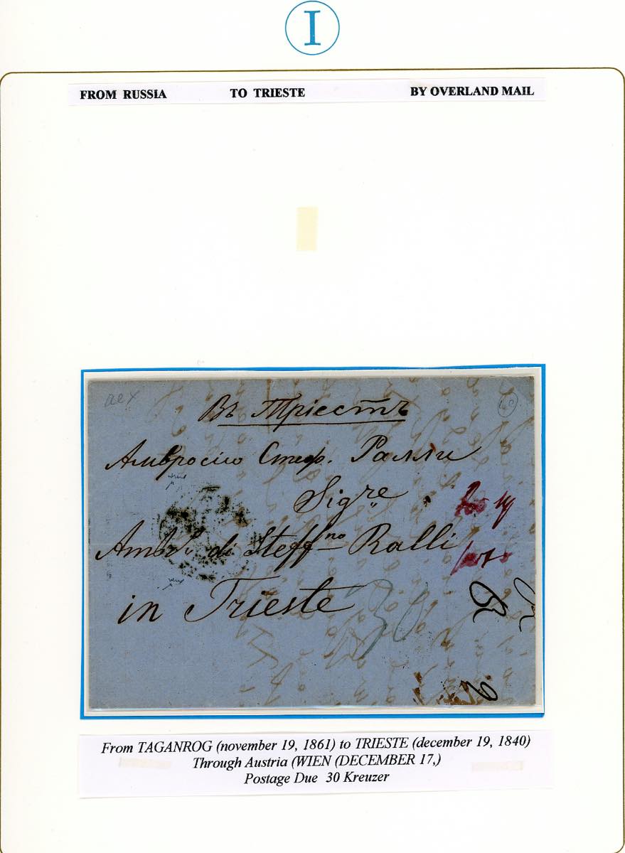 RUSSIA UCRAINA 1840/61 - Tre lettere prefilateliche o non affrancate da Taganrog a Trieste, con differenti tassazioni. Interessanti e montate in fogli da esposizione con relative descrizioni. Ex coll. Imperato.