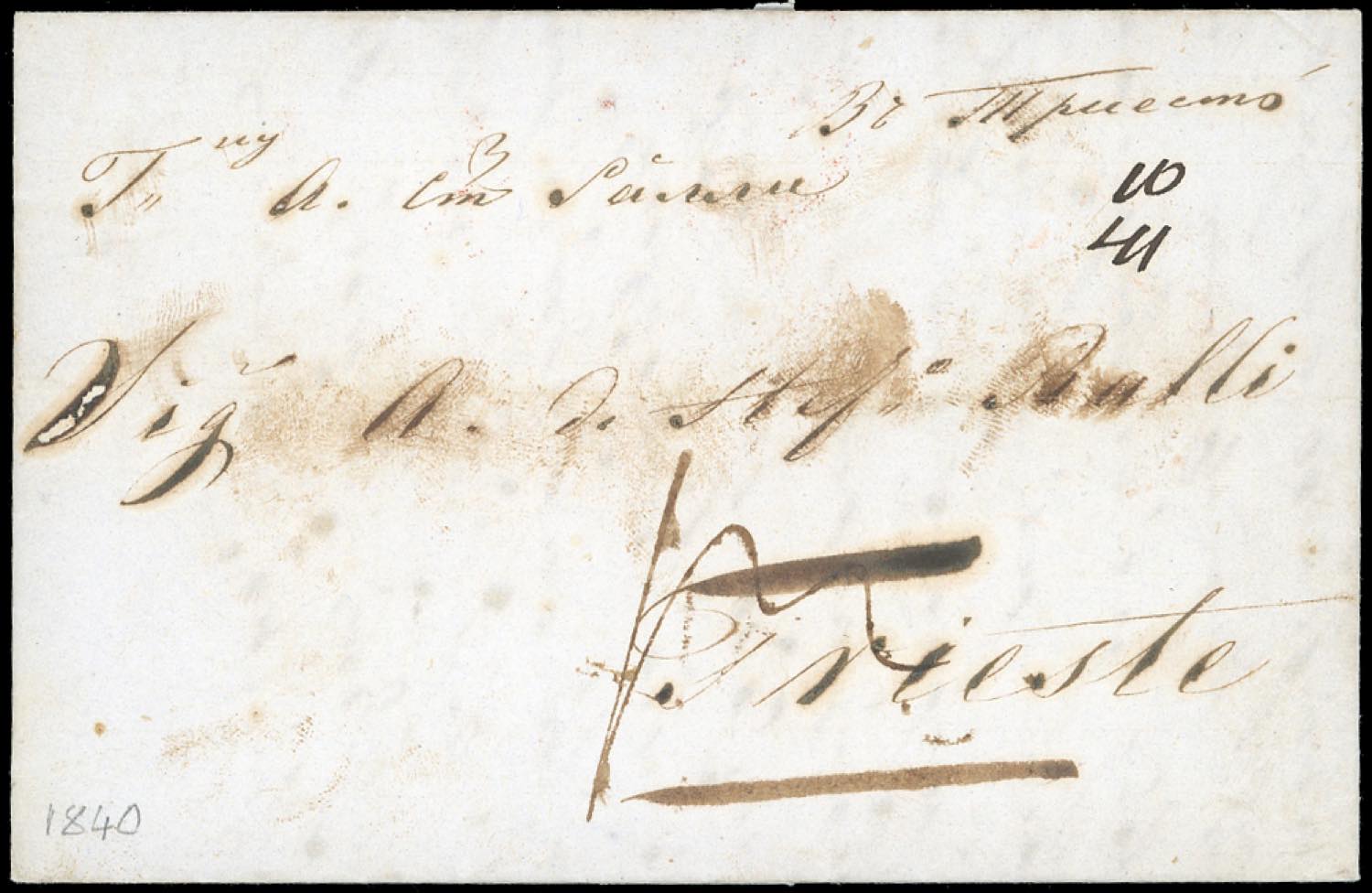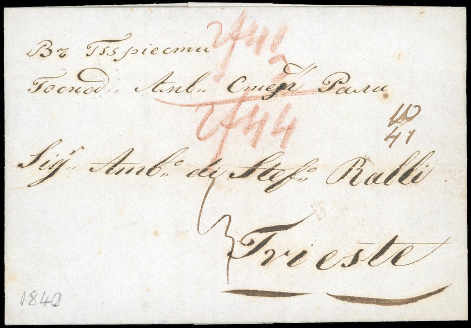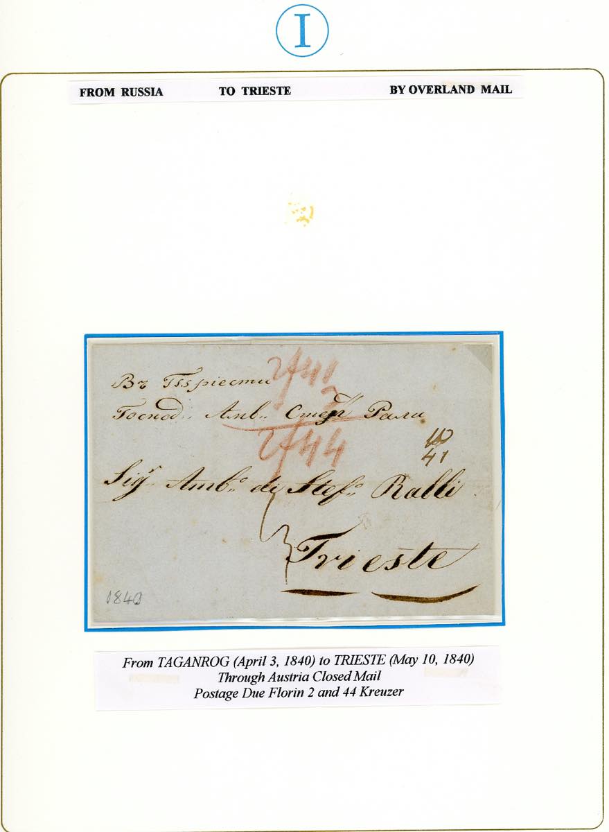 RUSSIA UCRAINA 1840/61 - Tre lettere prefilateliche o non affrancate da Taganrog a Trieste, con differenti tassazioni. Interessanti e montate in fogli da esposizione con relative descrizioni. Ex coll. Imperato.