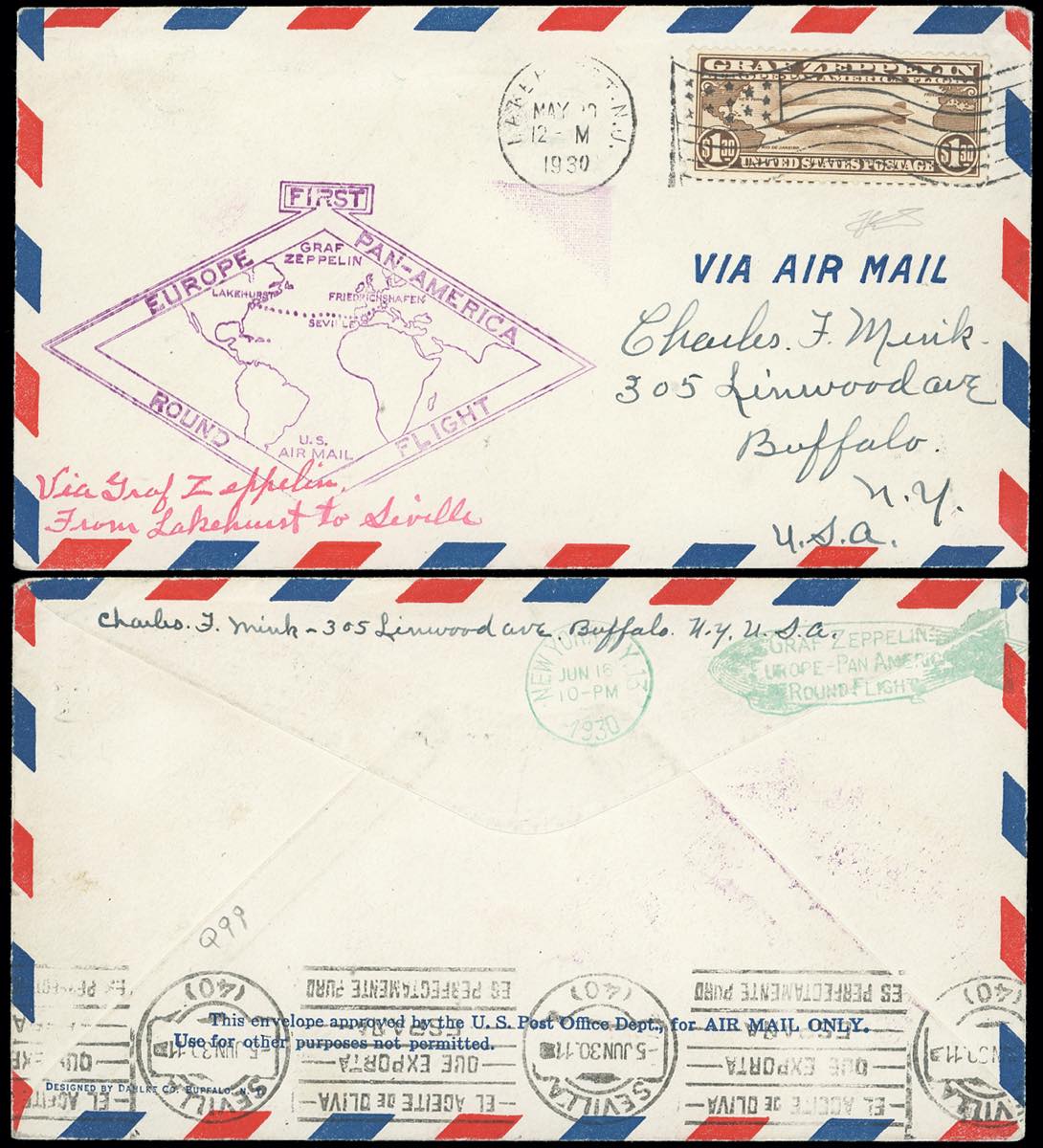 STATI UNITI D'AMERICA POSTA AEREA 1930 - Zeppelin, serie completa (Unificato A13/A15), perfetti, su tre aerogrammi con il bollo speciale della Crociera Zeppelin-Europa-Panamerica. Non comuni e molto belle. Ferrario.