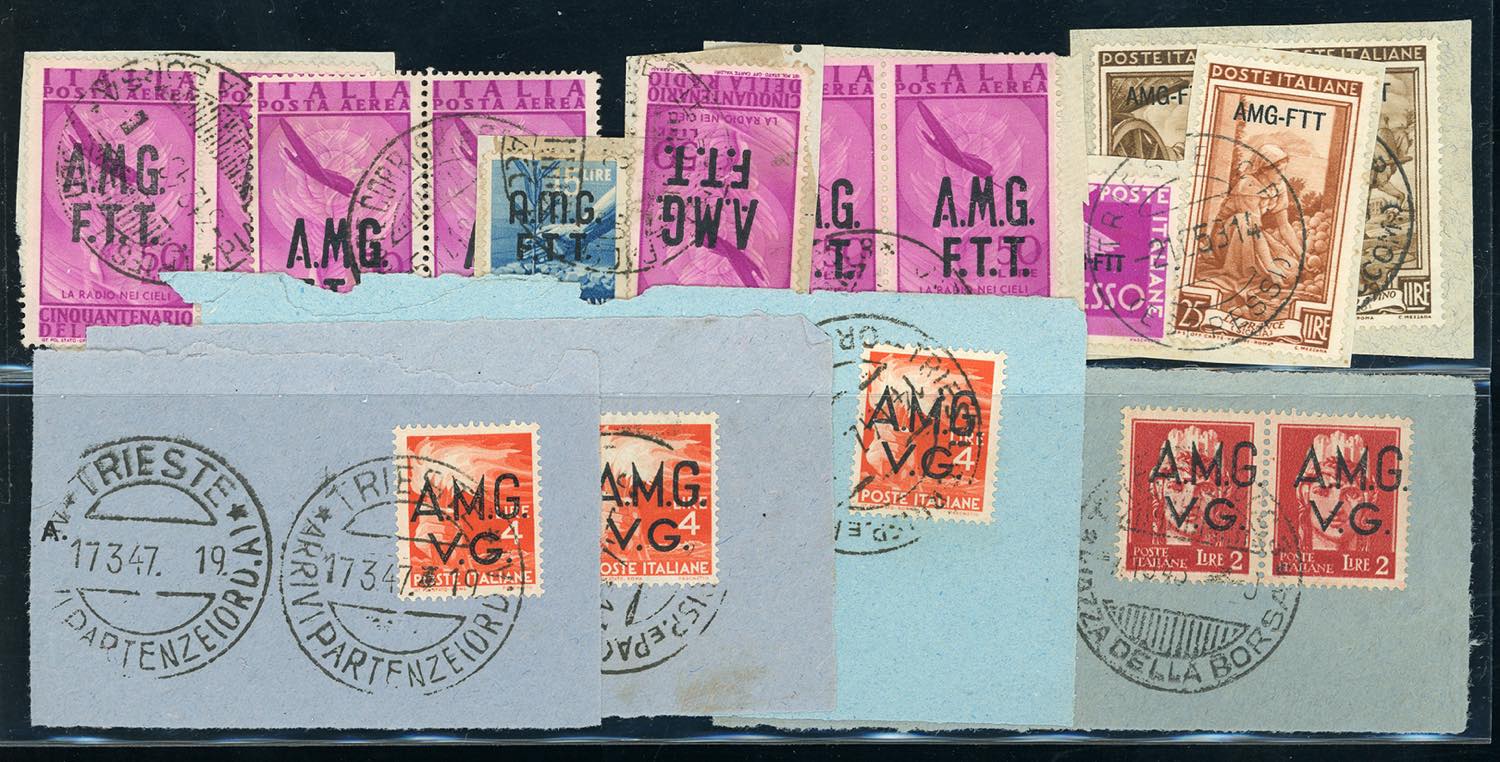 TRIESTE A AMG-FTT 1947/1954 - Dodici lettere affrancate del periodo e una piccola accumulazione di francobolli usati o su frammento soprastampati. Presente qualche esemplare di AMG-VG. Interessante.