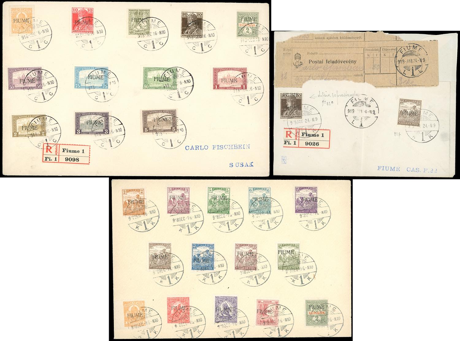 FIUME 1918/1919 - Ventotto esemplari soprastampati usati su tre buste filateliche, una parzialmente incompleta.
