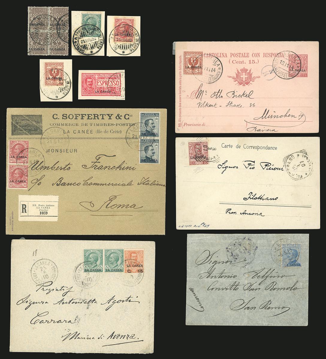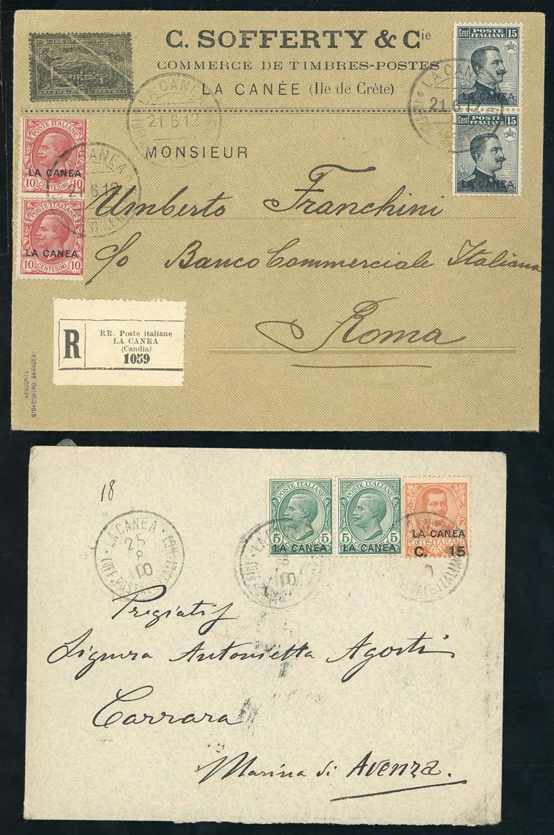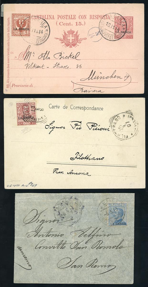 UFFICI POSTALI ALL'ESTERO-LA CANEA 1907/1914 - Quattro lettere, una cartolina postale e alcuni francobolli del periodo, con interessanti presenze. Notate 10 cent. Floreale (6) soprastampato su cartolina per l'Italia, firmato Em.Diena. Insieme di difficile reperibilità.
