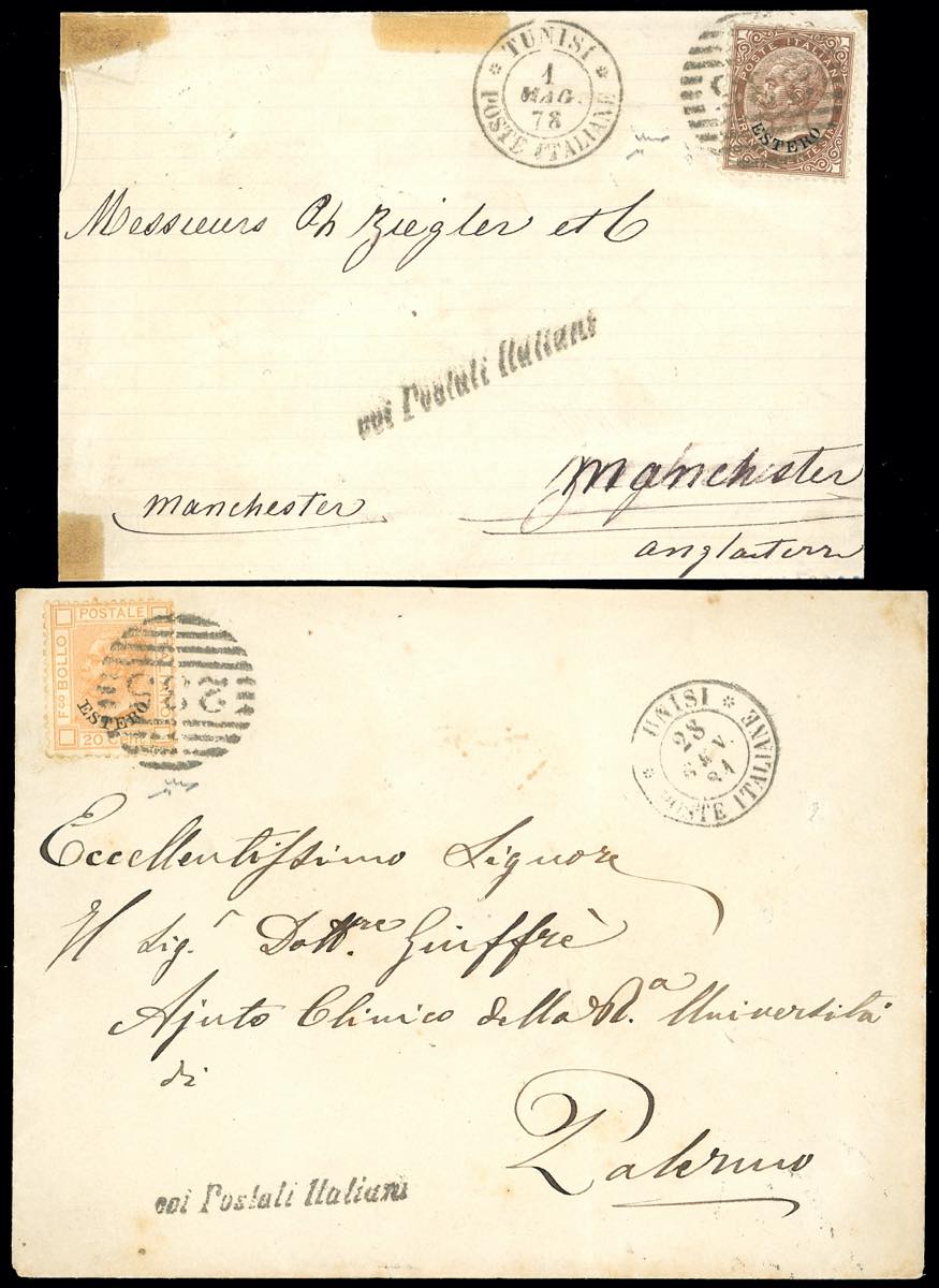 UFFICI POSTALI ALL'ESTERO-TUNISI 1865/1897 - Quattro lettere e una cartolina postale da/per Tunisi, con interessanti presenze. Per specialista. Ex coll. Imperato.