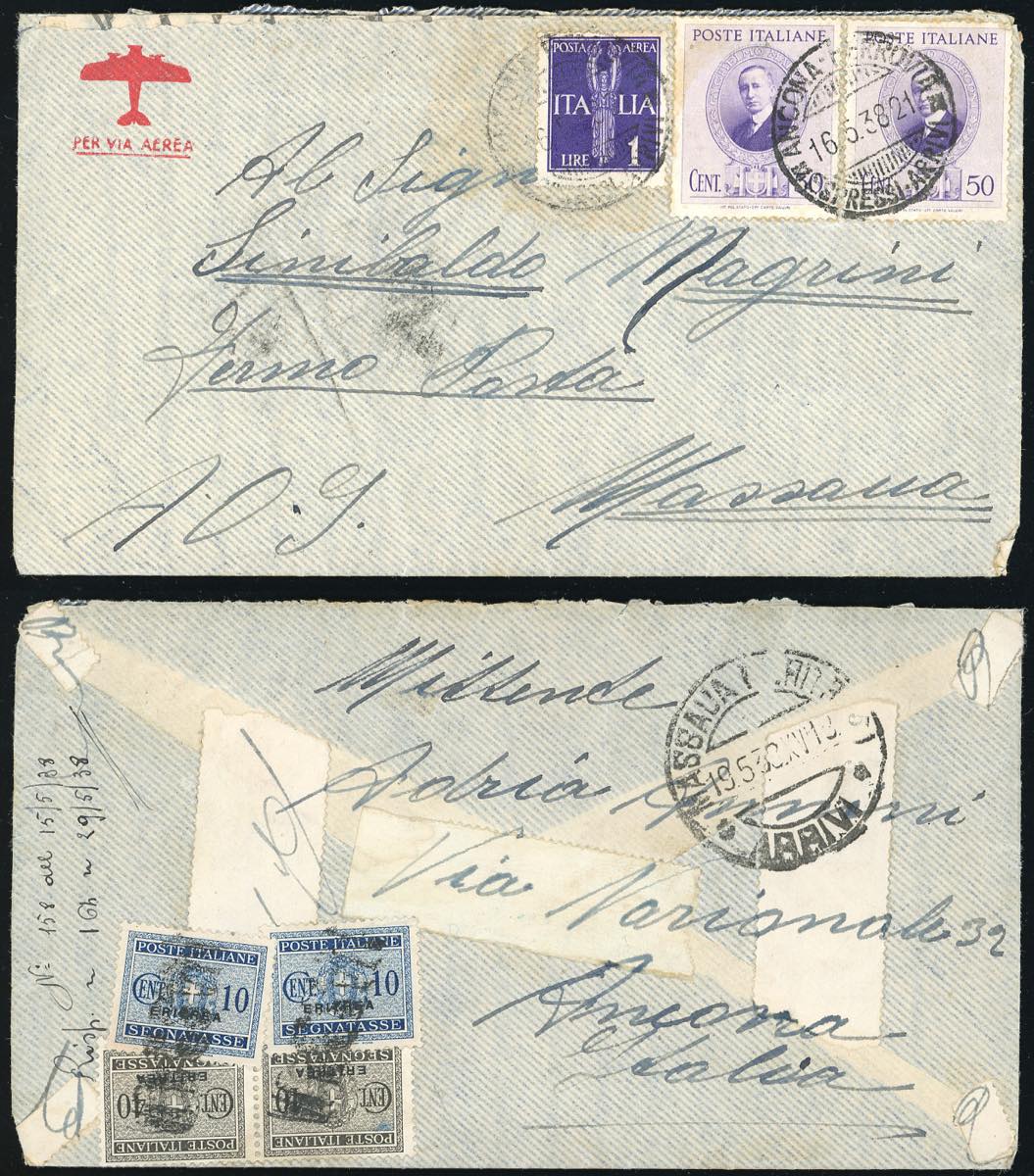 ERITREA 1938 - Bell'insieme di 7 aerogrammi dall'Italia a Massaua, tutti tassati in arrivo con segnatasse soprastampati dell'emissione del 1934, in differenti combinazioni. Allegate anche due lettere della medesima corrispondenza non tassate. Raro insieme non filatelico.