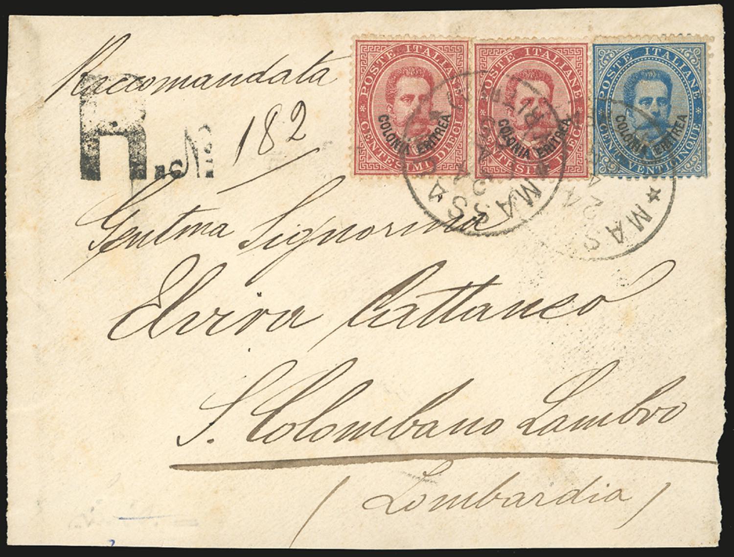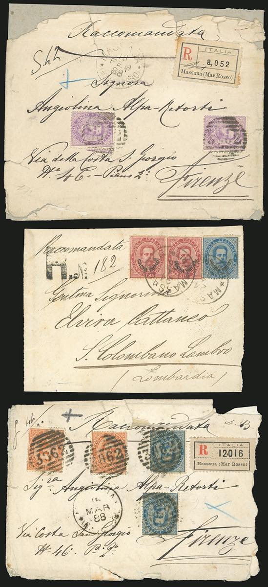 ERITREA MASSAUA 1888/1895 - Due buste e un frontespizio in partenza da Massaua, tutti raccomandati e affrancati con francobolli di Umberto I, soprastampati e non. Raro insieme, qualità mista.