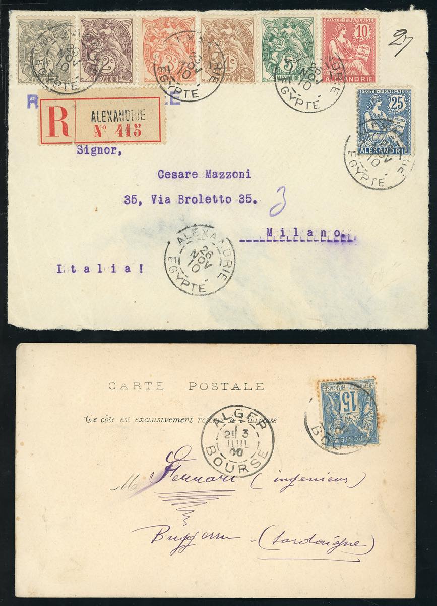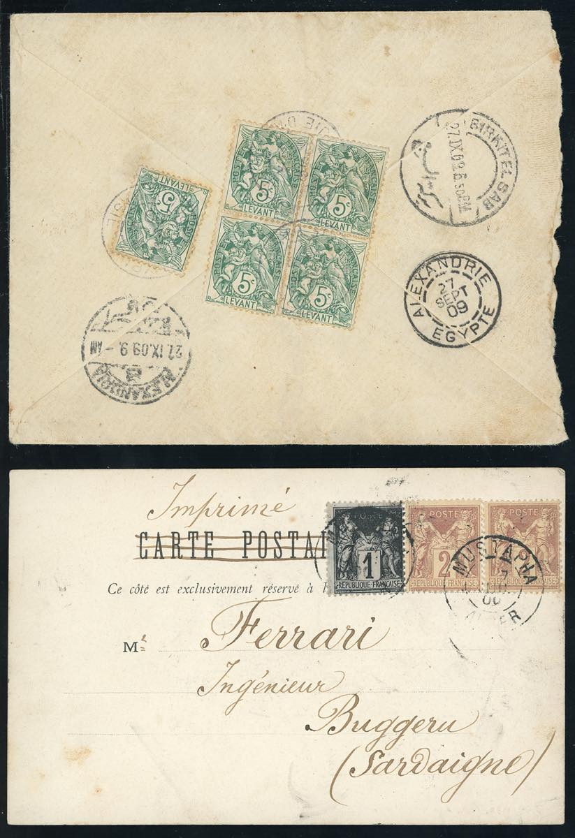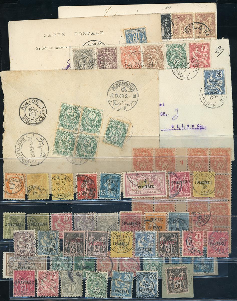 FRANCIA LEVANTE 1880/1910 - Piccolo insieme di francobolli, nuovi e usati, buste e cartoline affrancate del periodo.