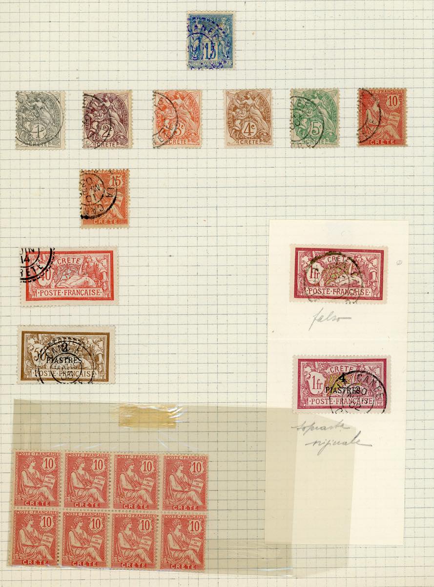 FRANCIA LEVANTE 1900/1920 - Collezione di francobolli, frammenti e due buste in foglio d'album artigianali, con interessanti presenze. Per ... Leggi tutto