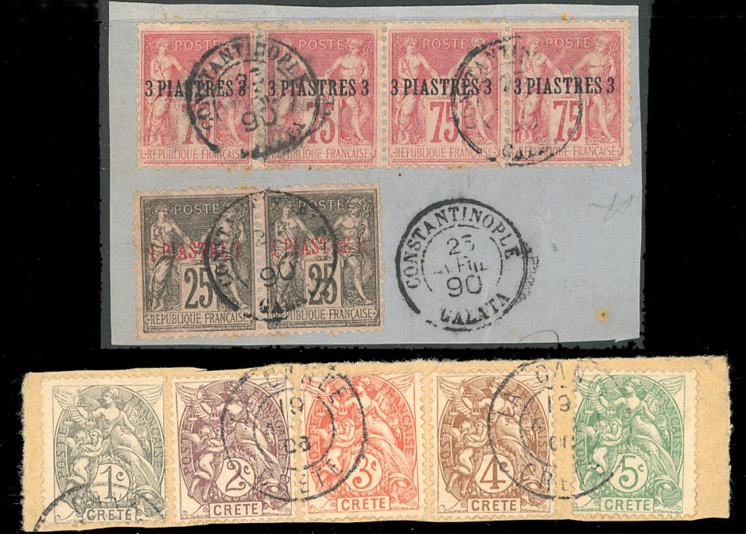 FRANCIA LEVANTE 1900/1920 - Collezione di francobolli, frammenti e due buste in foglio d'album artigianali, con interessanti presenze. Per specialista.