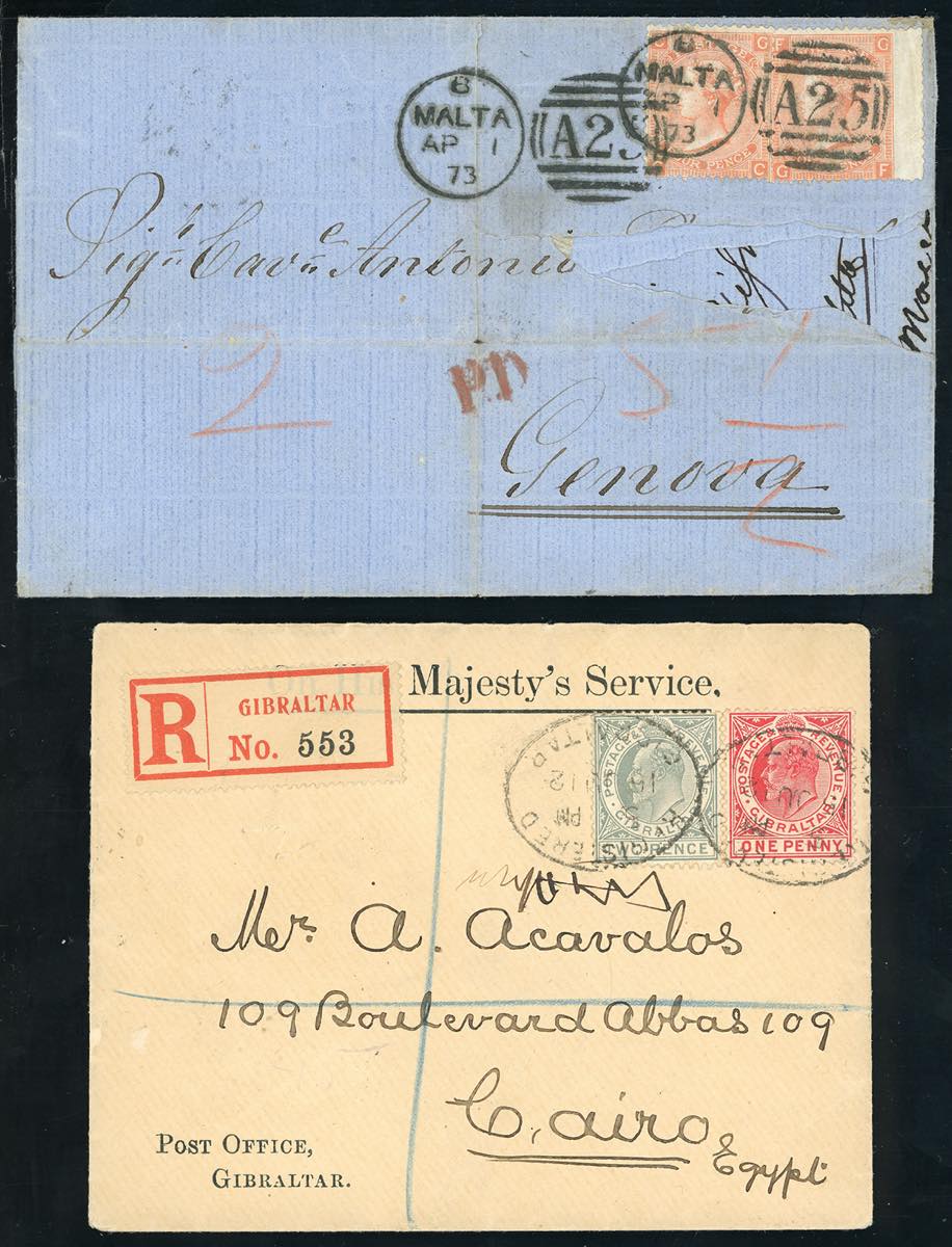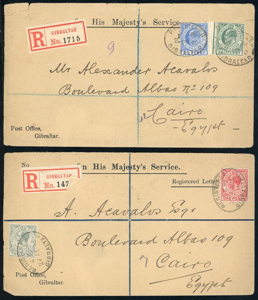 MALTA/GIBILTERRA 1907/1917 - Otto lettere, tra cui 5 raccomandate, affrancate con emissione del periodo.