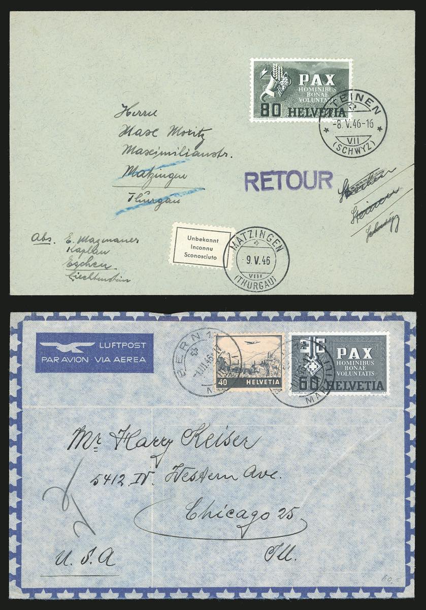 SVIZZERA 1945/1946 - Otto lettere affrancate con esemplari diversi della serie Pax, tra cui sei aerogrammi. Notato un aerogramma per ... Leggi tutto