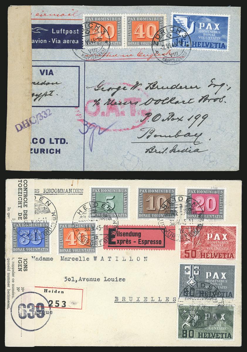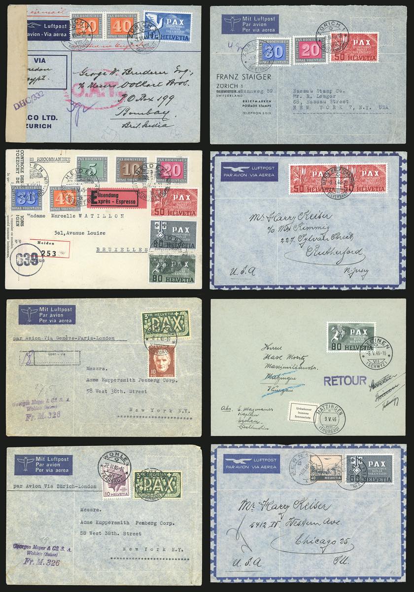 SVIZZERA 1945/1946 - Otto lettere affrancate con esemplari diversi della serie Pax, tra cui sei aerogrammi. Notato un aerogramma per l'India.