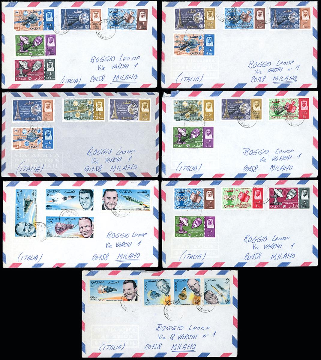 TEMATICA SPAZIO 1970 - Bell'insieme di sette aerogrammi dal Qatar all'Italia, tutti affrancati con emissioni a tema spazio, tra cui i pregevoli francobolli soprastampati. Rari.