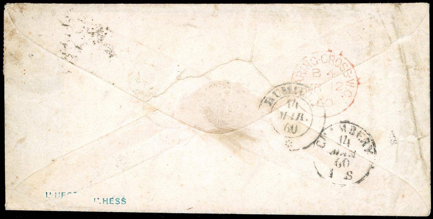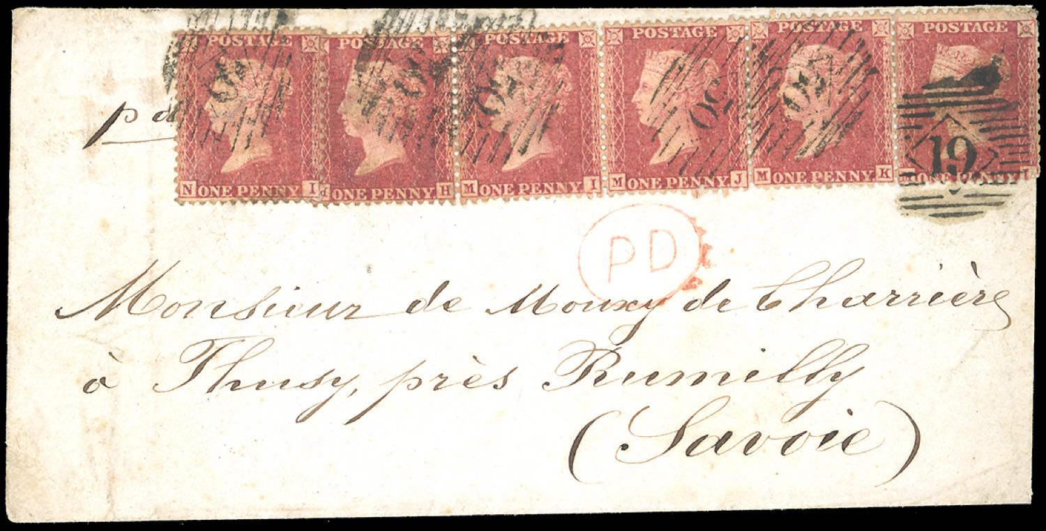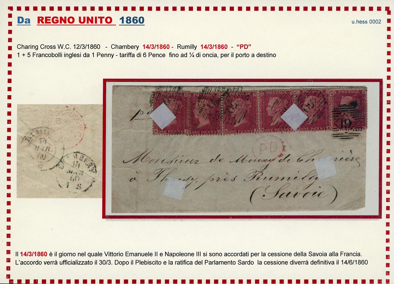 SARDEGNA SAVOIA-GRAN BRETAGNA 1860 - 1 penny, sei esemplari, su fresca lettera da Charing Cross 12/3/1860 a Rumilly in Savoia, giunta a destino il 14/3/1860 giorno dell'accordo per la cessione della Savoia alla Francia. Bella e rara. Ex coll. Hess.