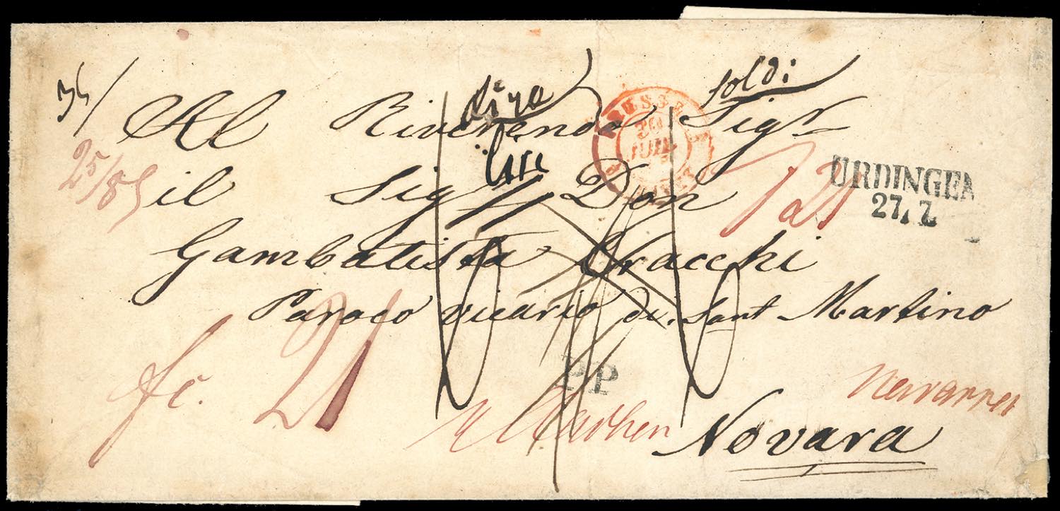 SARDEGNA-ANTICHI STATI TEDESCHI PRUSSIA 1840/50ca - Lettera prefilatelica da Verdingen/Krefeld 27/7 a Novara, con numerosi segni di tassazione sul fronte e al verso. Molto interessante, da studiare. Ex coll. Hess.