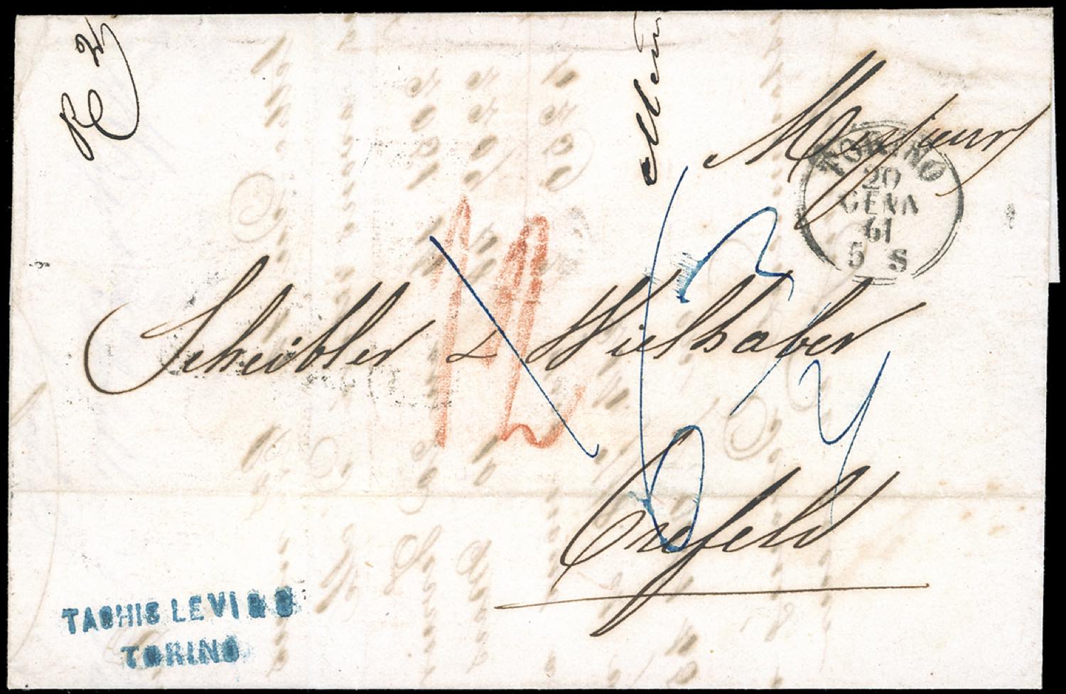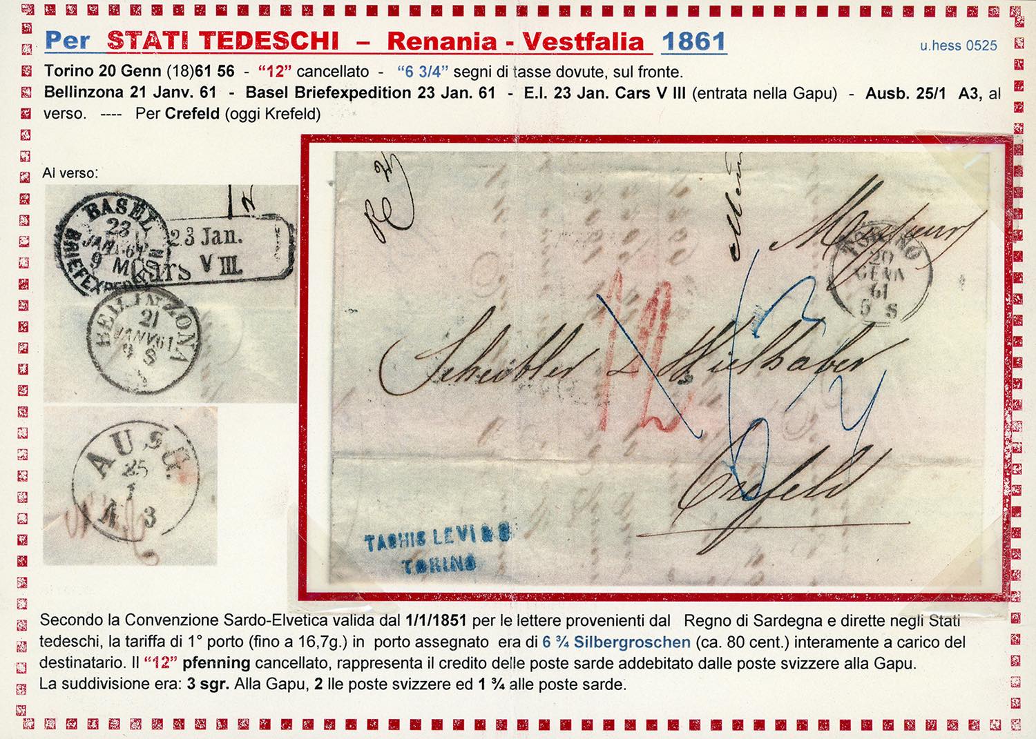 SARDEGNA-ANTICHI STATI TEDESCHI RENANIA VESTFALIA 1861 - Lettera non affrancata da Torino 20/1/1861 a Krefeld, sul fronte la tassa in azzurro di 6 3/4 Silbergroschen e il credito di 12 pf. addebitato dalle poste svizzere alla GAPU. Bella ed interessante. Allegata dettagliata descrizione storico postale. Ex coll. Hess.