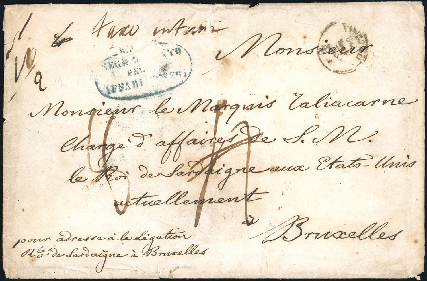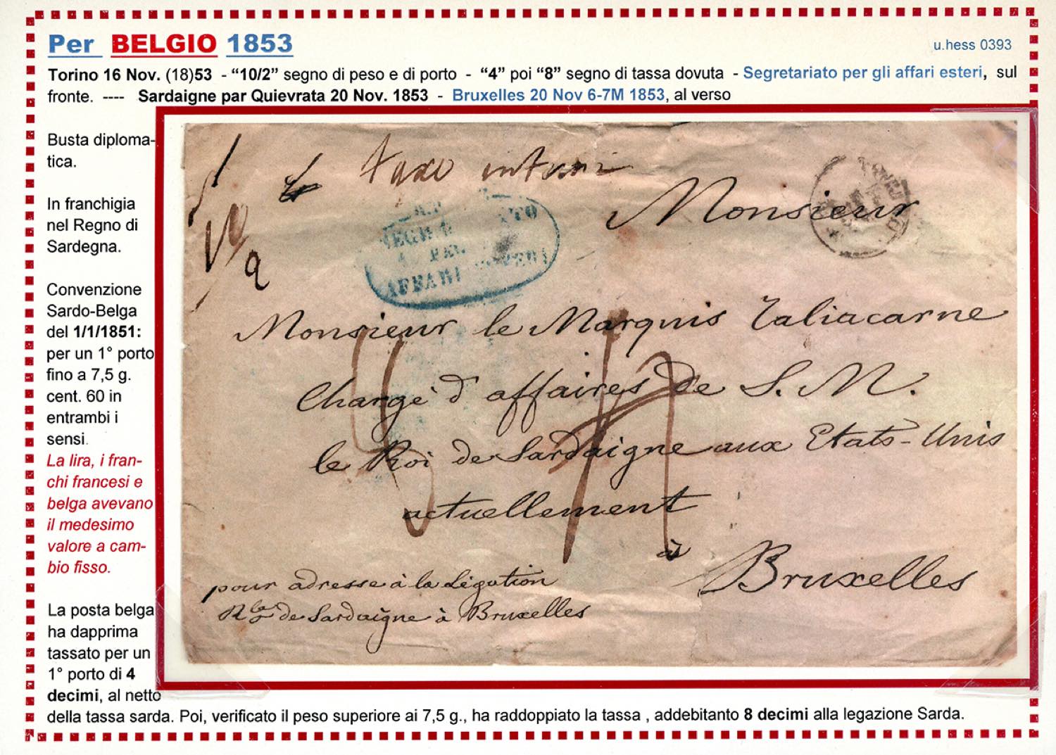 SARDEGNA-BELGIO 1853 - Busta diplomatica in franchigia, completa di sigillo al verso, da Torino 16/11/1853 a Bruxelles 20/11/1853, dapprima tassata 4, poi cassati e portati a 8 per il doppio porto. Interessante e non comune. Ferrario. Ex coll. Hess.