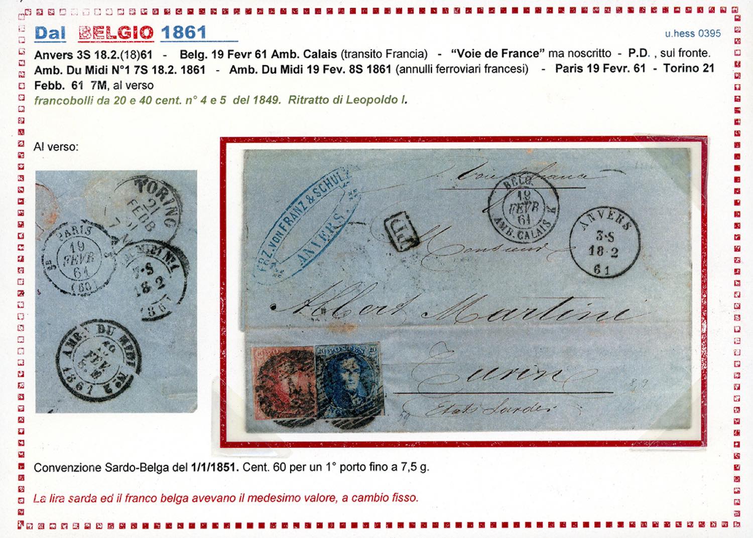 Lotto 59 - SARDEGNA-BELGIO 1861 - Lettera da Anversa 18/2/1861, via di ...