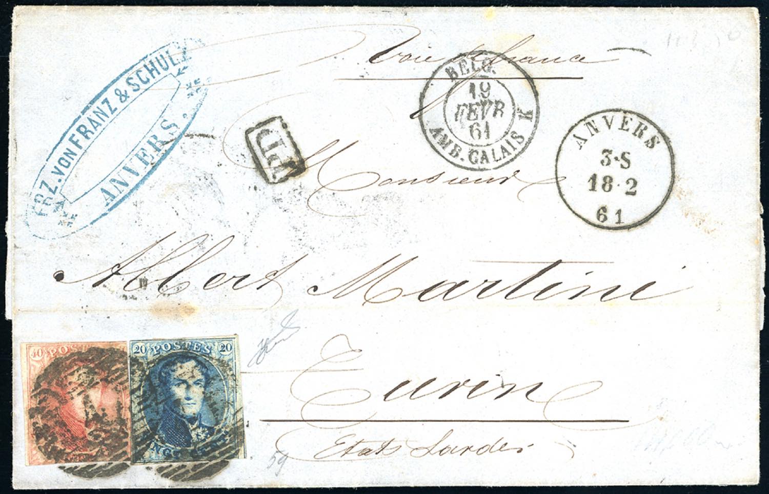 SARDEGNA-BELGIO 1861 - Lettera da Anversa 18/2/1861, via di Francia, a Torino 21/2, affrancata con 20 e 40 cent. Leopoldo I (4,5). Ferrario. Ex coll. Hess.