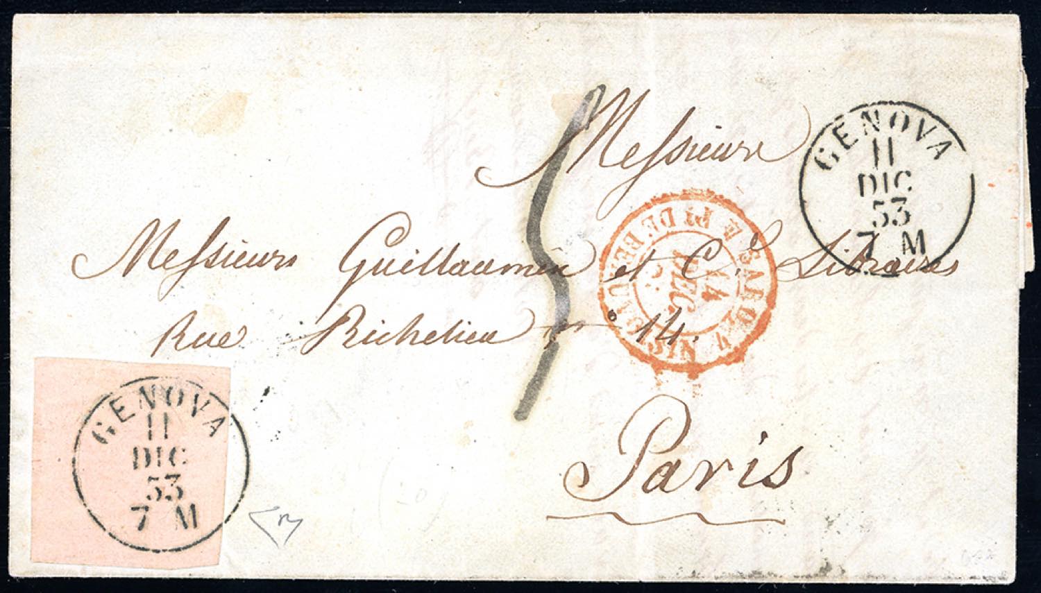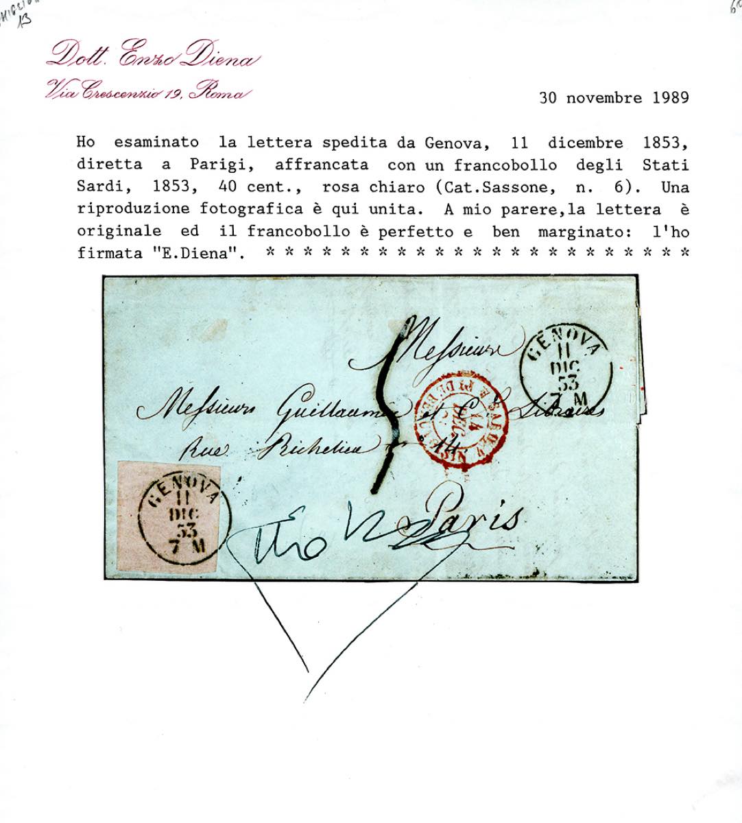 SARDEGNA-FRANCIA 1853 - 40 cent. rosa chiaro (6), bordo di foglio a sinistra, perfetto e ben marginato, isolato su fresca lettera insufficientemente affrancata da Genova 11/12/1853 a Parigi, tassata 5. Interessante e di ottima qualità. Cert. E.Diena.
