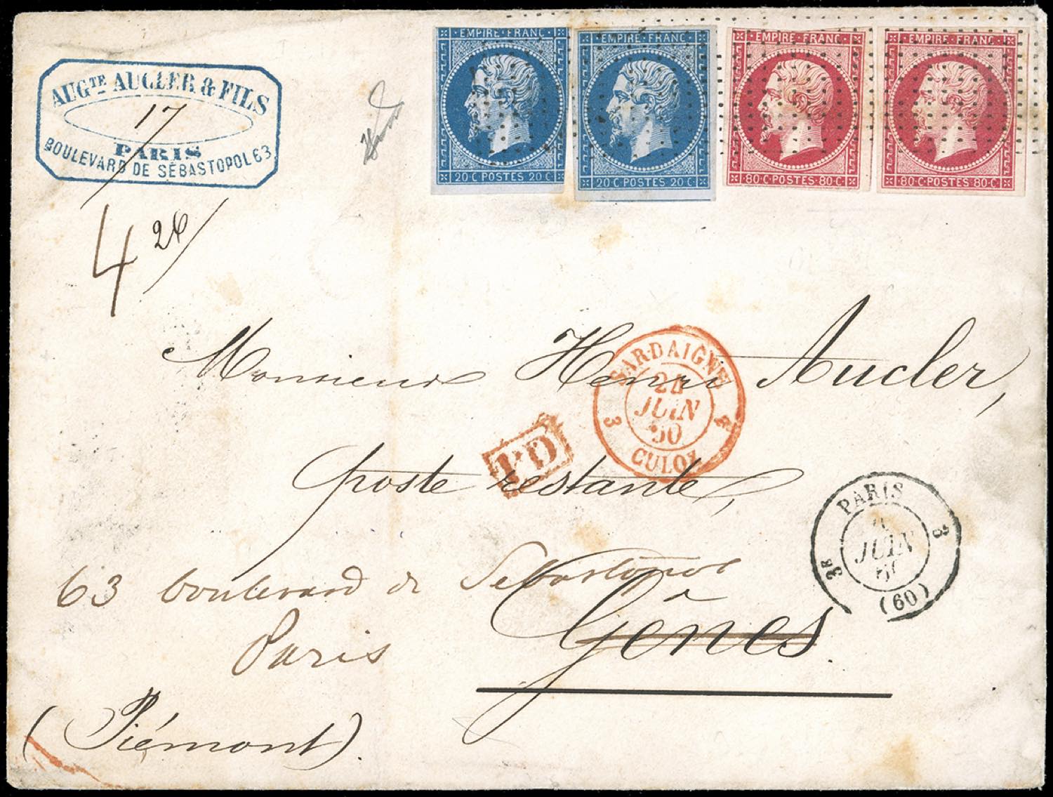 SARDEGNA-FRANCIA 1860 - 20 cent., 40 cent. Napoleone III (Unificato 14,16), entrambi due esemplari, su busta di 4 porti da Parigi 4/6/1860 a Genova, rispedita a Parigi, al verso lineare "retrodato". Pregevole porto multiplo, rara. Ferrario. Ex coll. Hess.