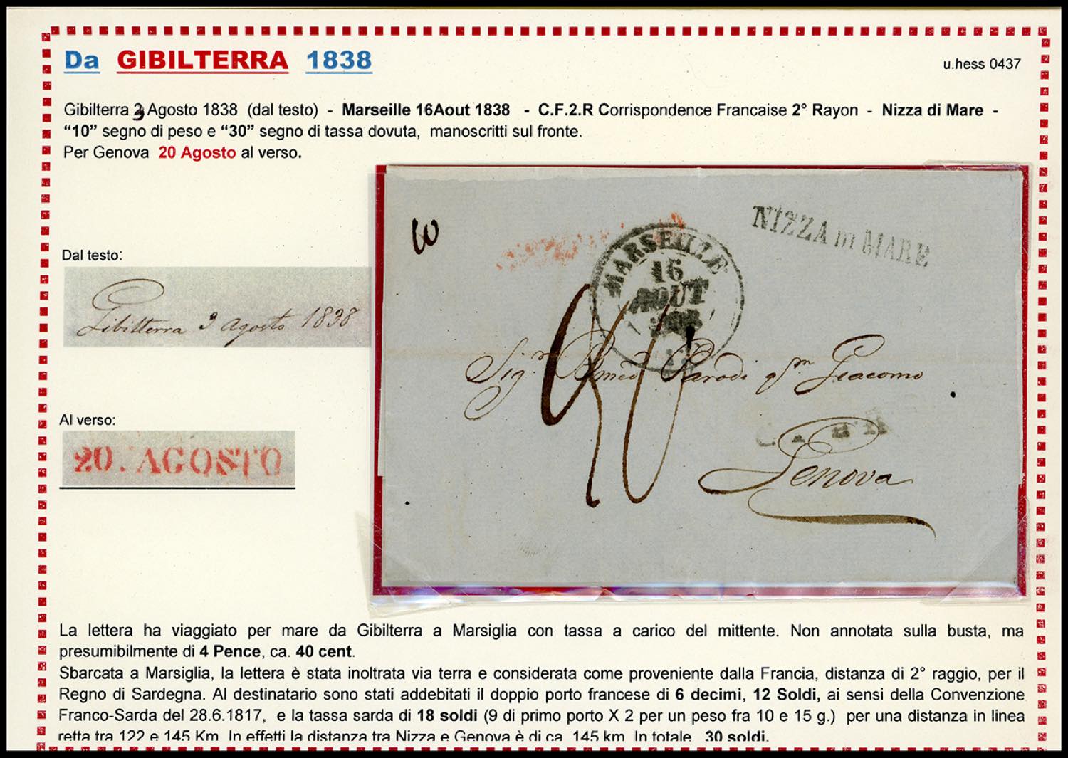 SARDEGNA-GIBILTERRA 1838 - Lettera scritta a Gibilterra il 3 agosto 1838, viaggiata via di mare fino a Marsiglia, dove giunse il 16/8, da qui proseguì verso Genova per la via di terra, dove giunse a destino il 20/8. La lettera reca il segno "10" per il peso, doppio porto, e 30 cent. per la tassazione, composta da 12 soldi (doppio porto francese) e 18 soldi (tassa sarda di secondo porto). Molto interessante e rara per il tipo di tragitto. Ferrario. Ex coll. Hess.