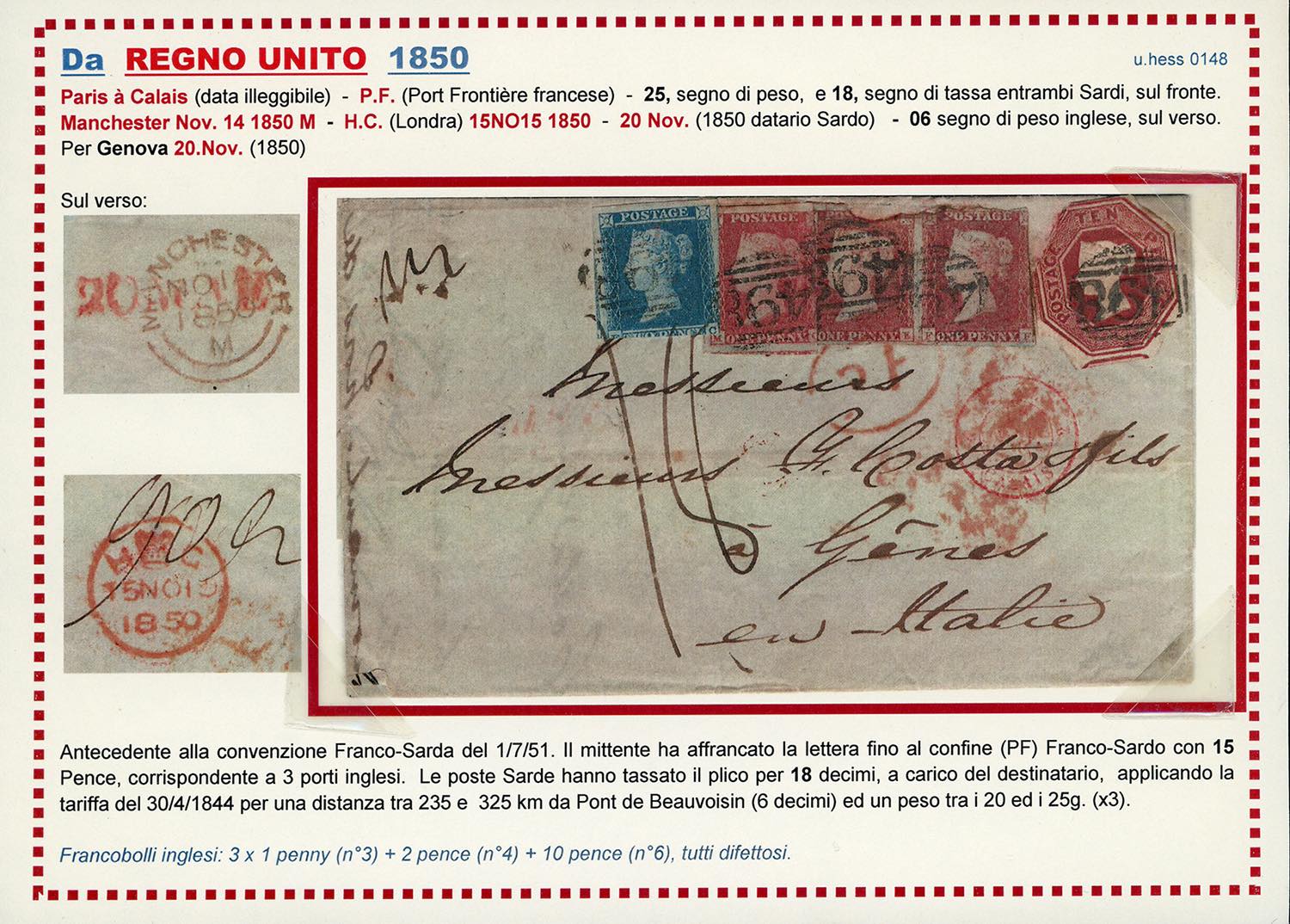 SARDEGNA-GRAN BRETAGNA 1850 - Lettera di tre porti, affrancata per 15 pence con 1 p., tre esemplari (3), 2 p. (4), e 10 p. (6), difetti, spedita da Manchester 14/11/1850 a Genova, tassata 18. Il secondo francobollo è stato riapplicato in maniera non ottimale, ma faceva parte dell'affrancatura. Rara affrancatura multipla. Ex coll. Hess.