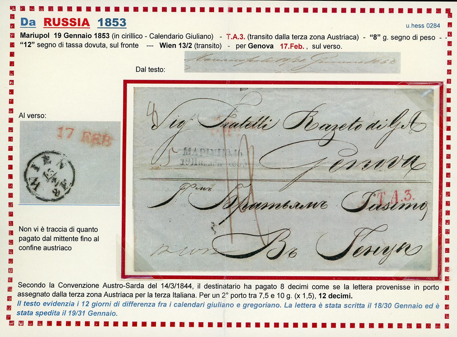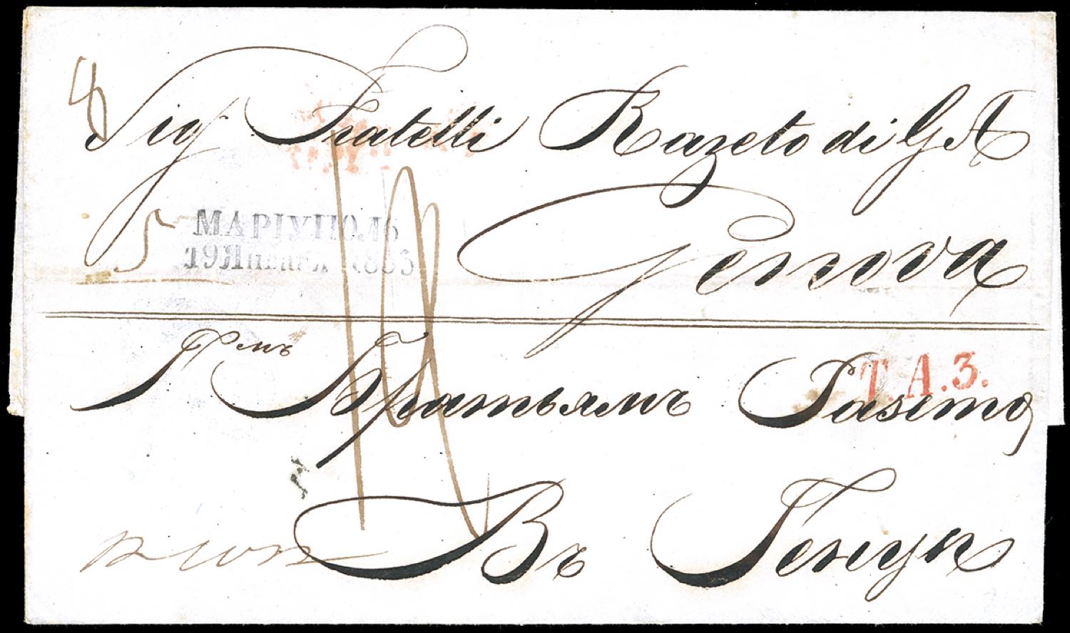 SARDEGNA-IMPERO RUSSO UCRAINA 1853 - Lettera di doppio porto non affrancata da Mariupol 31/1/1853 a Genova, tassata in arrivo 12 decimi, bollo in rosso T.A.3. Non comune. Allegata descrizione storico postale. Ex coll. Hess.