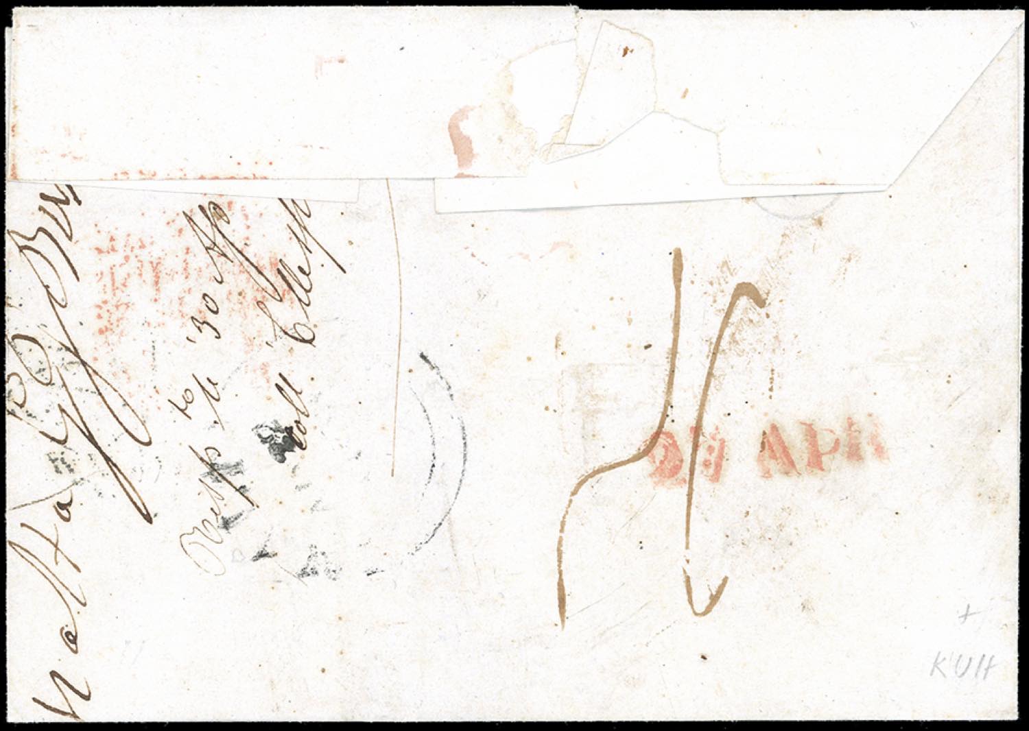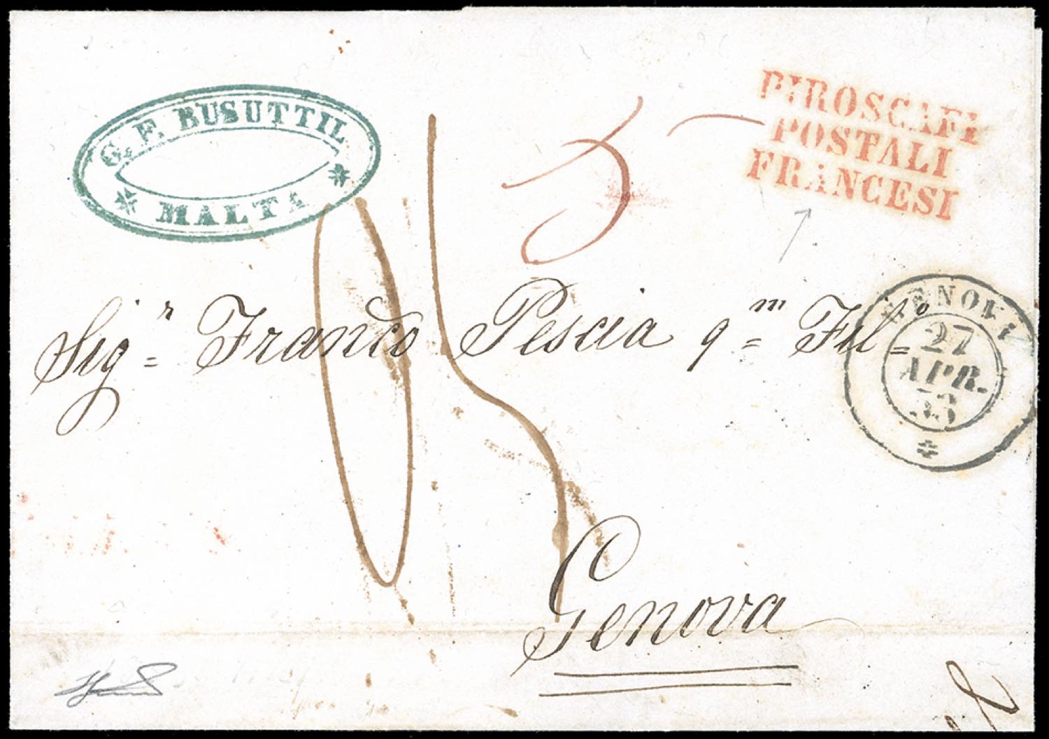 SARDEGNA-MALTA 1853 - Lettera non affrancata da Malta 22/4/1853 a Genova, trasportata con il vapore postale francese Hellespont, al verso la tariffa pagata dal mittente di 5 d., comprensivi anche del porto marittimo francese, sul fronte la tassa sarda di 5 cent., per la sola tariffa d'ingresso nel porto. Interessante e non comune. Ferrario. Ex coll. Hess.