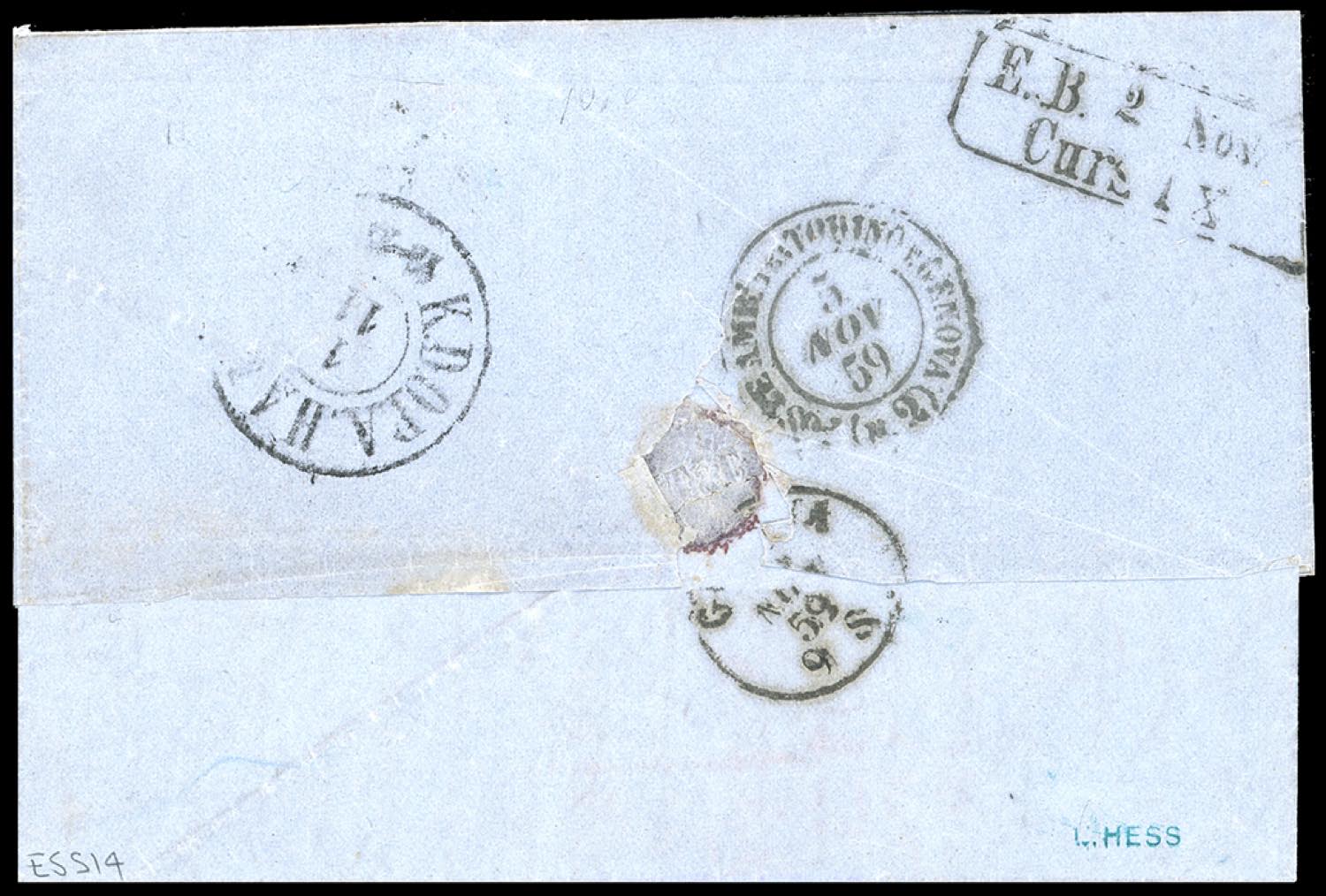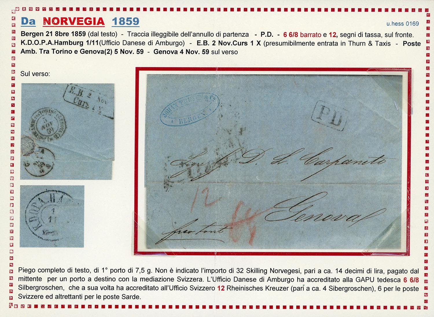 SARDEGNA-NORVEGIA 1859 - Lettera in porto pagato in contanti da Bergen 21/10/1859 a Genova, sul fronte indicati gli importi alle singole amministrazioni postali che hanno intermediato nel trasporto, dettagliatamente spiegati nella descrizione storico postale allegata. Rara incoming mail. Ferrario. Ex coll. Hess.