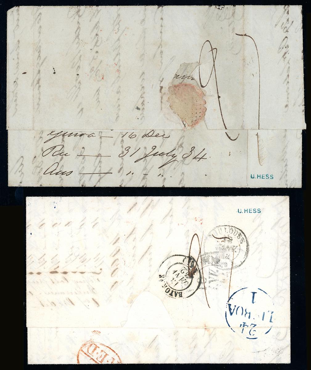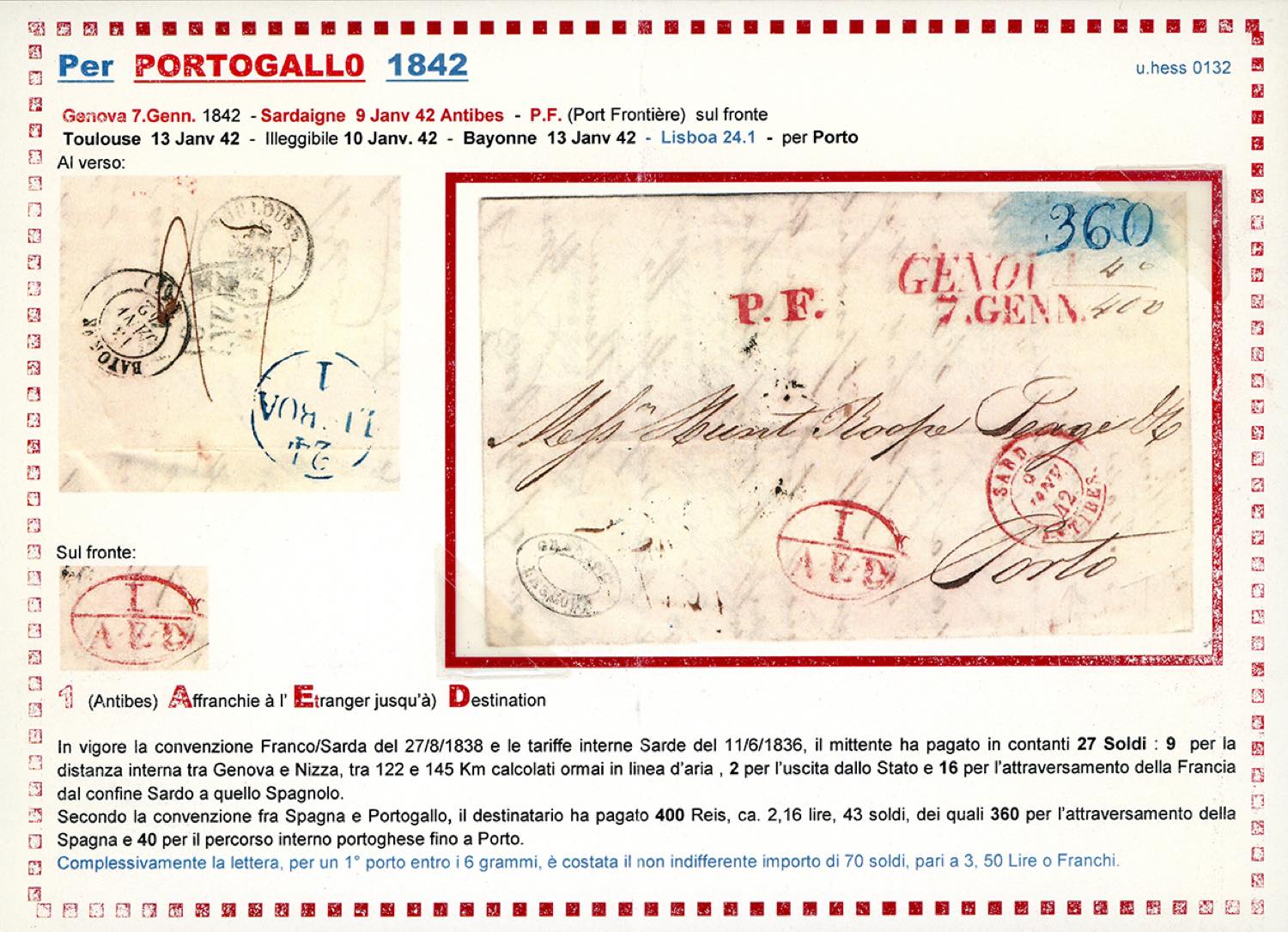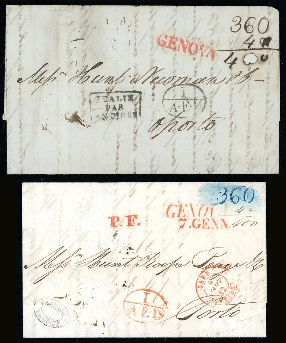 SARDEGNA-PORTOGALLO 1833/1842 - Due lettere prefilateliche: una scritta a Livorno ma messa in posta a Genova 16/12/1833 per Oporto; l'altra da Genova 7/1/1842 a Porto, entrambe con il porto di 27 soldi, pagato in contanti e annotato al verso e tassate in arrivo 360 reis + 40 reis per il porto interno. Interessante e non comune destinazione. Allegate dettagliate descrizioni storico postali. Ex coll. Hess.