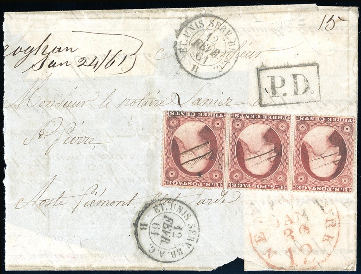 SARDEGNA-STATI UNITI D'AMERICA 1861 - 3 cent. Washington (Unificato 11), striscia orizzontale di 3, perfetta, su frontespizio di lettera da New York 31/1/1861 per Aosta. Non comune. Ex coll. Imperato.