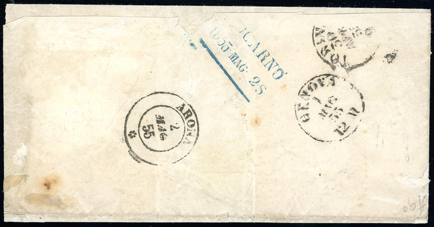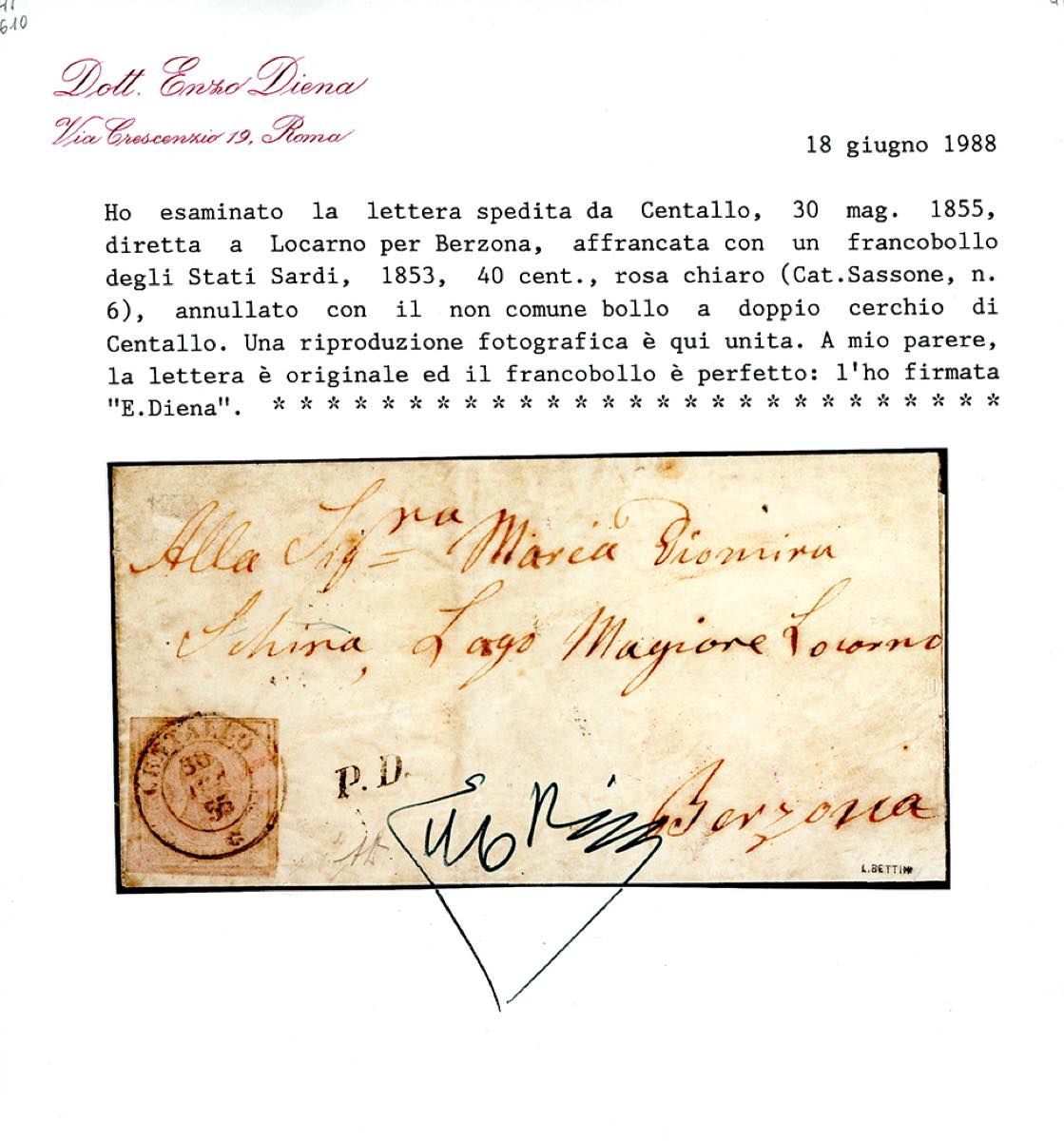 SARDEGNA-SVIZZERA 1855 - 40 cent. rosa chiaro (6), perfetto, isolato su lettera da Centallo 30/5/1855 per Berzona, Locarno. Non comune lettera tra due località minori. A.Diena, Ferrario, cert. E.Diena.