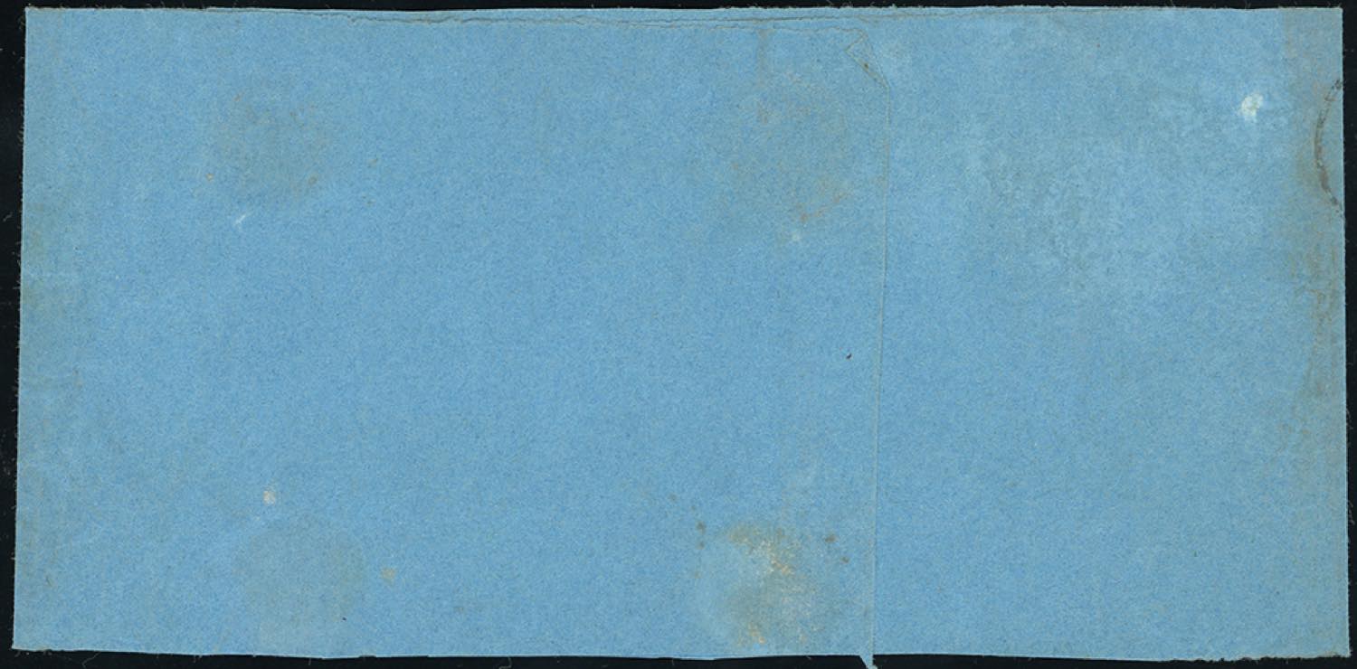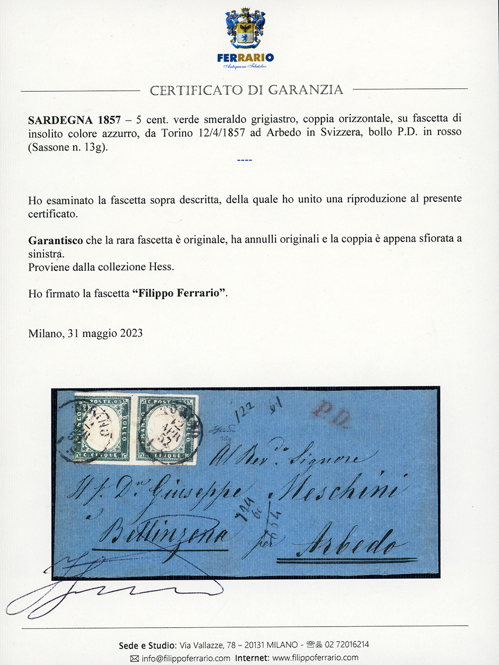 SARDEGNA-SVIZZERA 1857 - 5 cent. verde smeraldo grigiastro (13g), coppia orizzontale, tre ottimi margini, leggermente a filo a destra, su fresca fascetta di insolito colore azzurro, da Torino 12/4/1857 ad Arbedo in Svizzera. Splendida e tariffa estremamente rara per la Svizzera. Da esposizione. Cert. Ferrario.