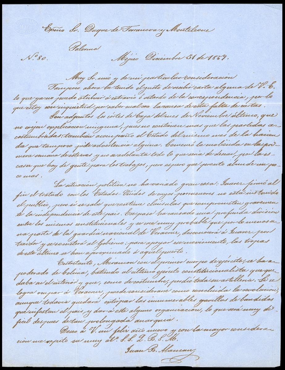 SICILIA-MESSICO 1859 - Splendida lettera scritta in Messico il 31/12/1859, bollo di Londra 1/2/1860, transito francese, giunta a Palermo il 9/2/1860, con varie tassazioni. All'interno vi è un dettagliato testo inerente agli eventi politici messicani del tempo. Si parla del Governo Provvisorio di Benito Juarez, della rivoluzione e i movimenti militari in corso nel paese, riguardo al trattato stipulato con gli Stati Uniti. Rara incoming mail e importante testimonianza storica. Ferrario. Ex collezione Imperato.