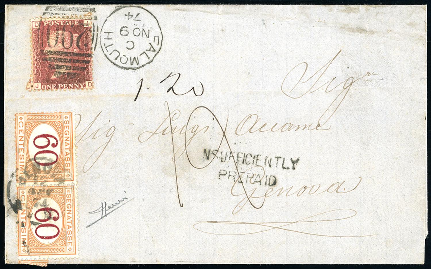 REGNO D'ITALIA-GRAN BRETAGNA 1874 - 1 p. rosso (Unificato 26), perfetto, su lettera insufficientemente affrancata da Falmouth 9/11/1874 a Genova, tassata in arrivo con una coppia orizzontale del segnatasse da 60 cent. (10). Sorani.