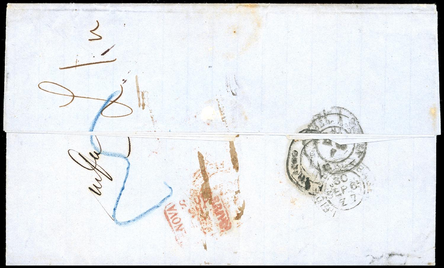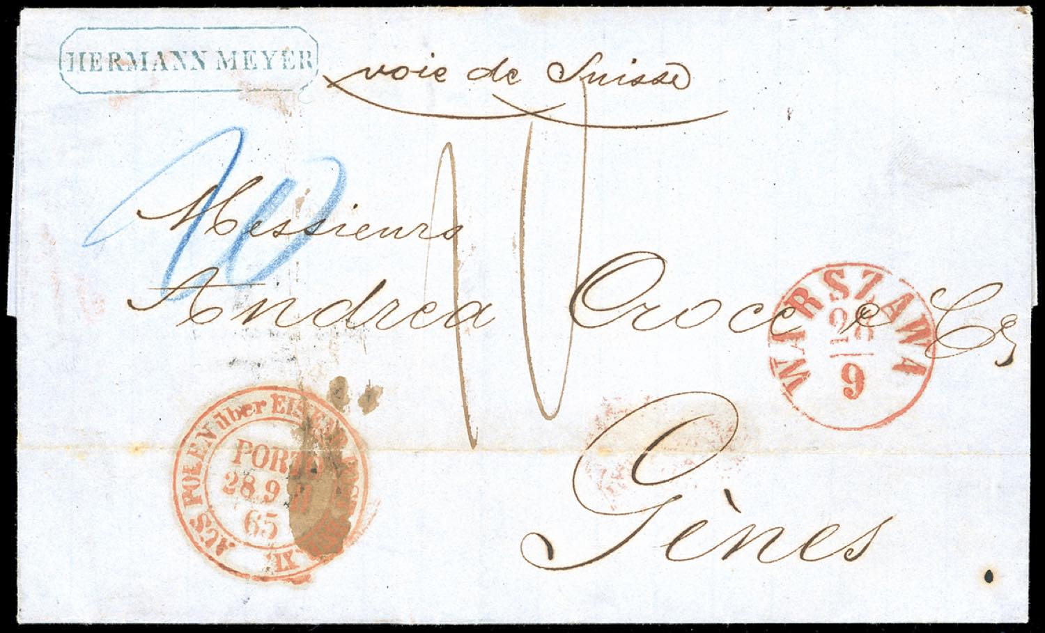 REGNO D'ITALIA-IMPERO RUSSO POLONIA 1865 - Lettera non affrancata da Varsavia 28/97/1865 a Genova, via di Svizzera, con diversi segni di tassazione sul fronte e al verso. Non comune. Ex coll. Imperato.