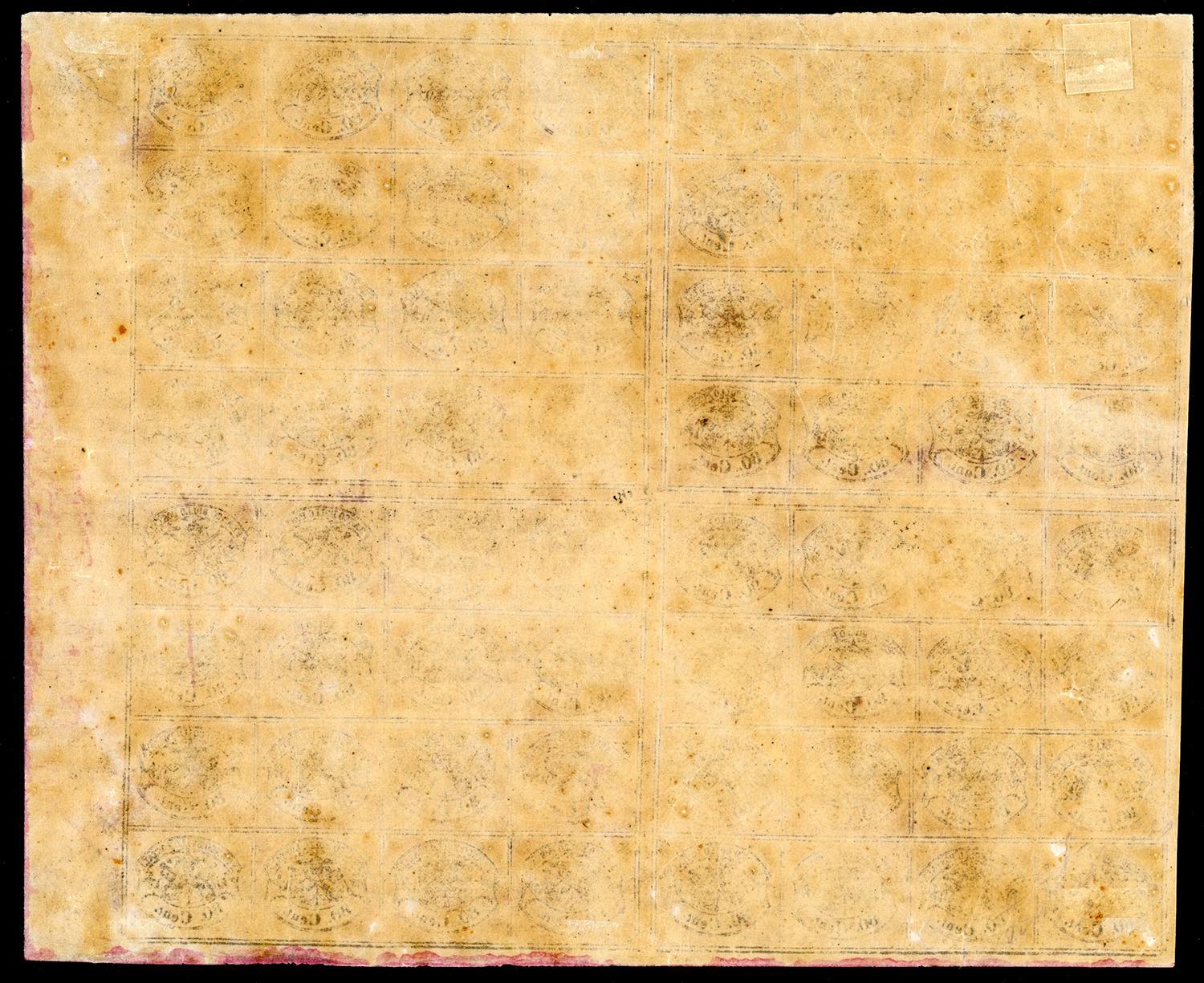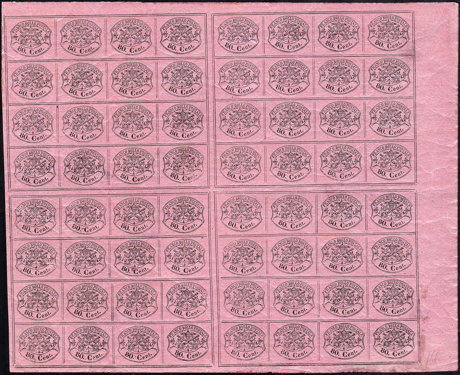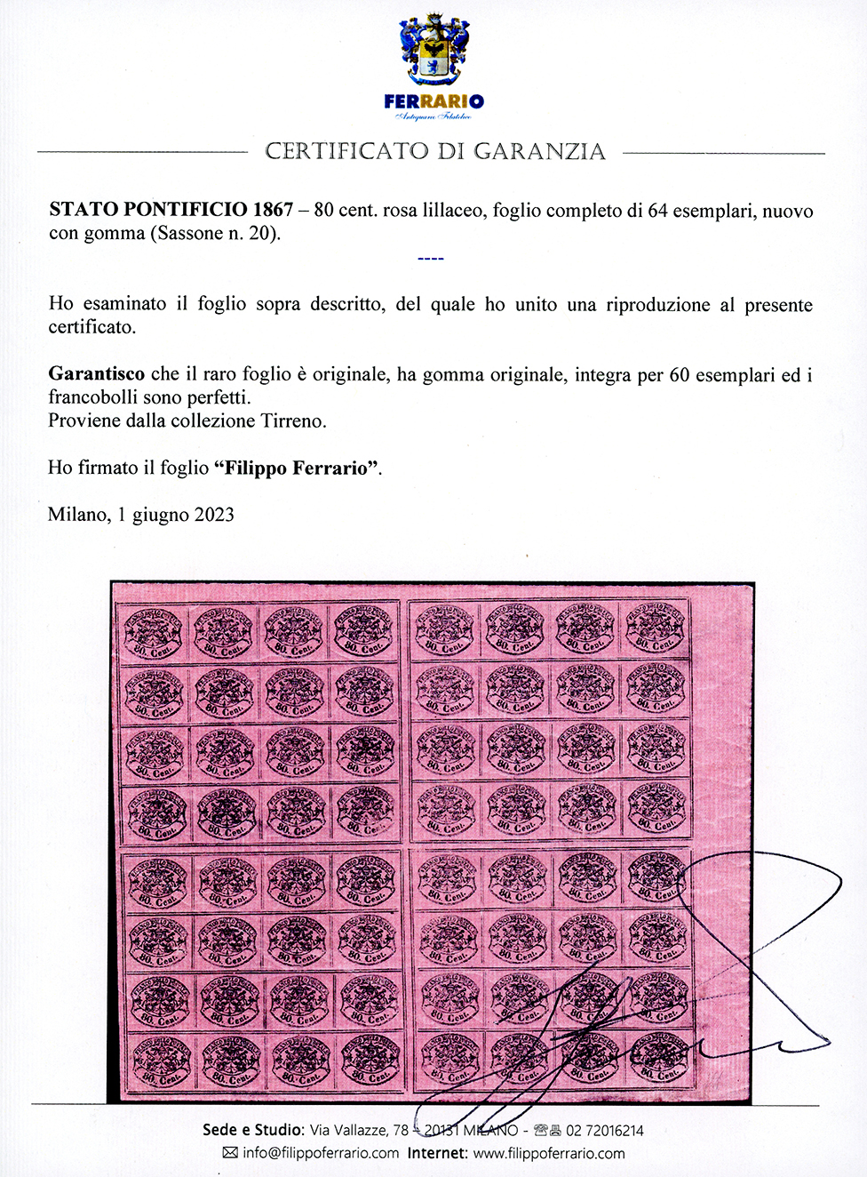1867 - 80 cent. rosa lillaceo (20), foglio completo di 64 esemplari, gomma originale, integra per 60 esemplari, perfetto. Raro! Ex coll. Tirreno. A.Diena. Cert. Ferrario.