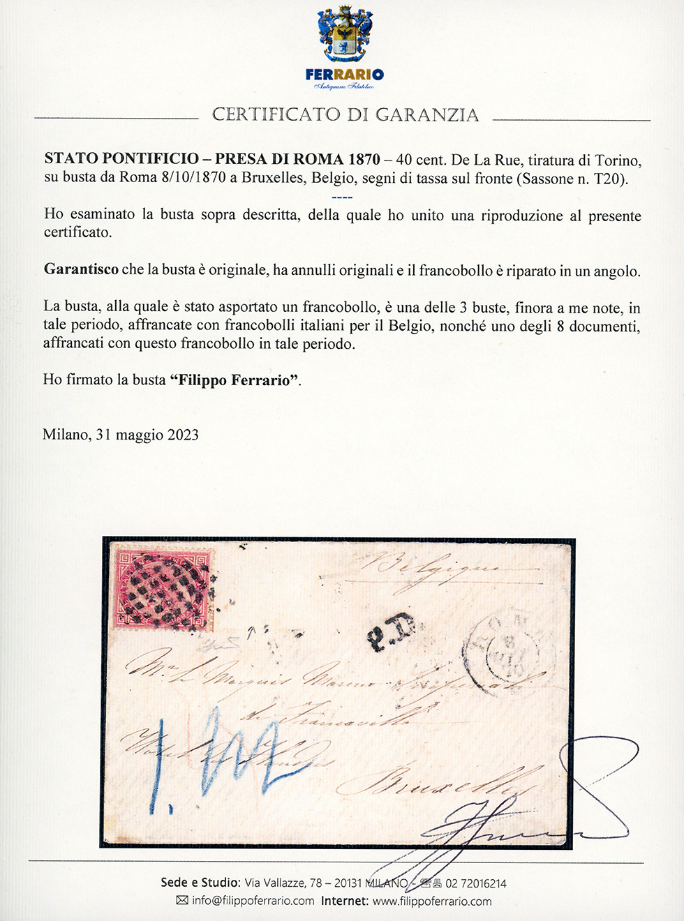 1870 - 40 cent. De La Rue, tiratura di Torino (T20), un angolo riparato, su busta da Roma 8/10/1870 a Bruxelles, Belgio, segni di tassa sul fronte. La lettera, alla quale è stato asportato un francobollo, è una delle 3 lettere note affrancate con francobolli italiani per il Belgio, nonché uno degli 8 documenti noti affrancati con questo francobollo in tale periodo. Rarità. Cert. Ferrario.