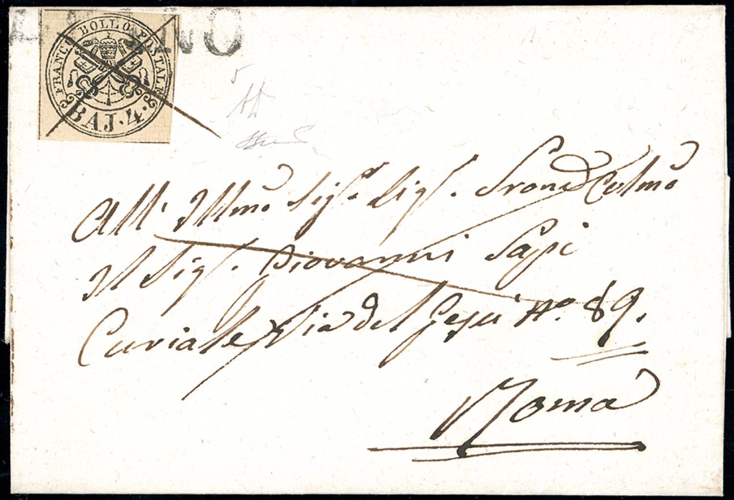 ALBANO, lineare + penna non catalogato - 4 baj (5), perfetto, su fresca lettera per Roma. Interessante combinazione di annulli ad oggi inedita. A.Diena, Ferrario. Ex coll. Andreotti.