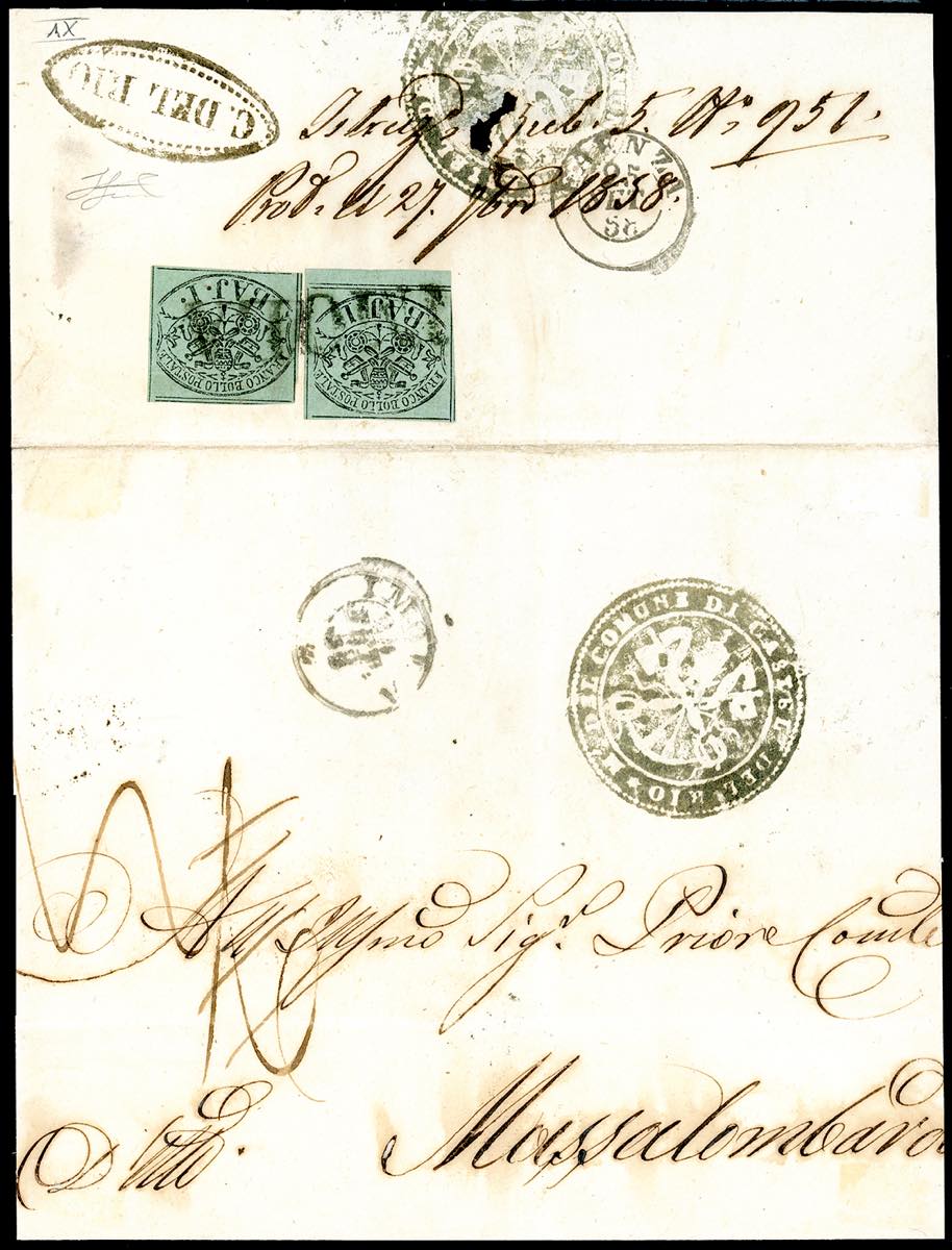 CASTEL DEL RIO, punti 8 - 1 baj (2), due esemplari, perfetti, al verso di lettera in porto assegnato del 24/9/1856 a Massalombarda. ... Leggi tutto