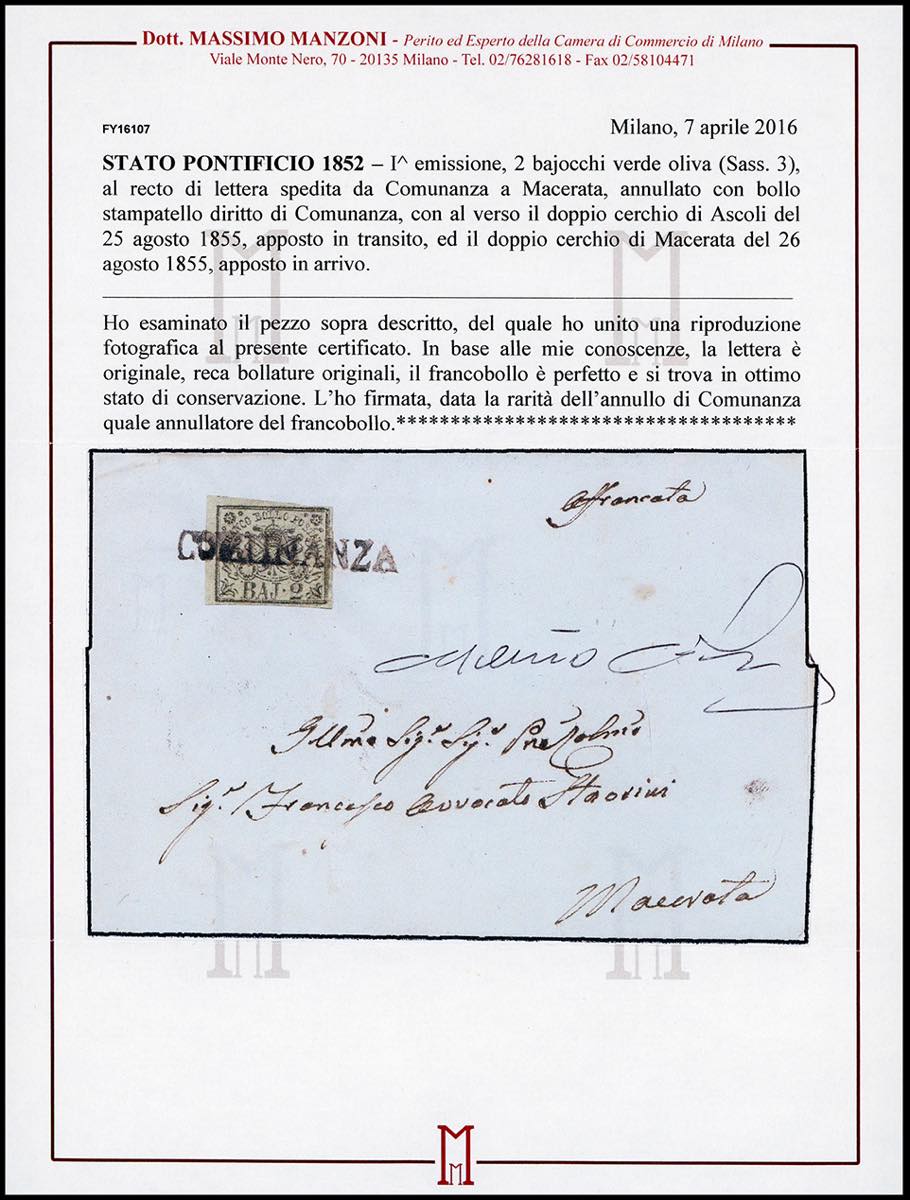 COMUNANZA, punti R2 - 2 baj (3), perfetto, su lettera per Macerata 26/8/1855. Molto rara. Cert. Manzoni.
