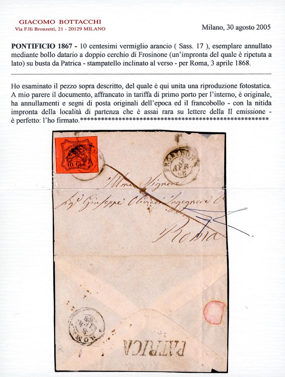 PATRICA, punti R2 - 10 cent. (17), perfetto, su busta del 3/4/1868, datario di Frosinone annullatore, a Roma. Estremamente raro su lettere affrancate con la II emissione, pochissimi casi noti. Raybaudi, Ferrario, cert. Bottacchi.