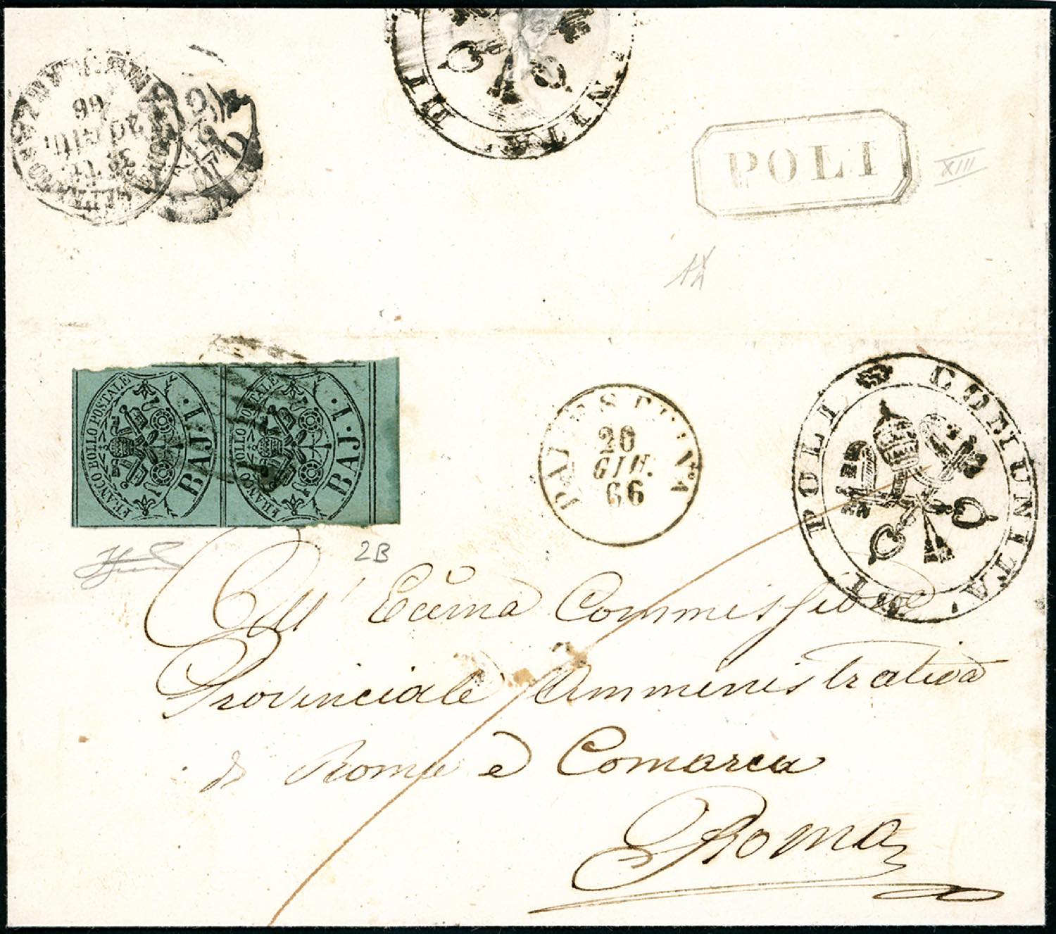 POLI, cartella punti 10 - 1 baj verde scuro, II composizione (2B), coppia verticale, bordo di foglio, perfetta, su fresca lettera del 20/6/1866 per Roma. Bella. A.Diena, Ferrario. Ex coll. Andreotti.