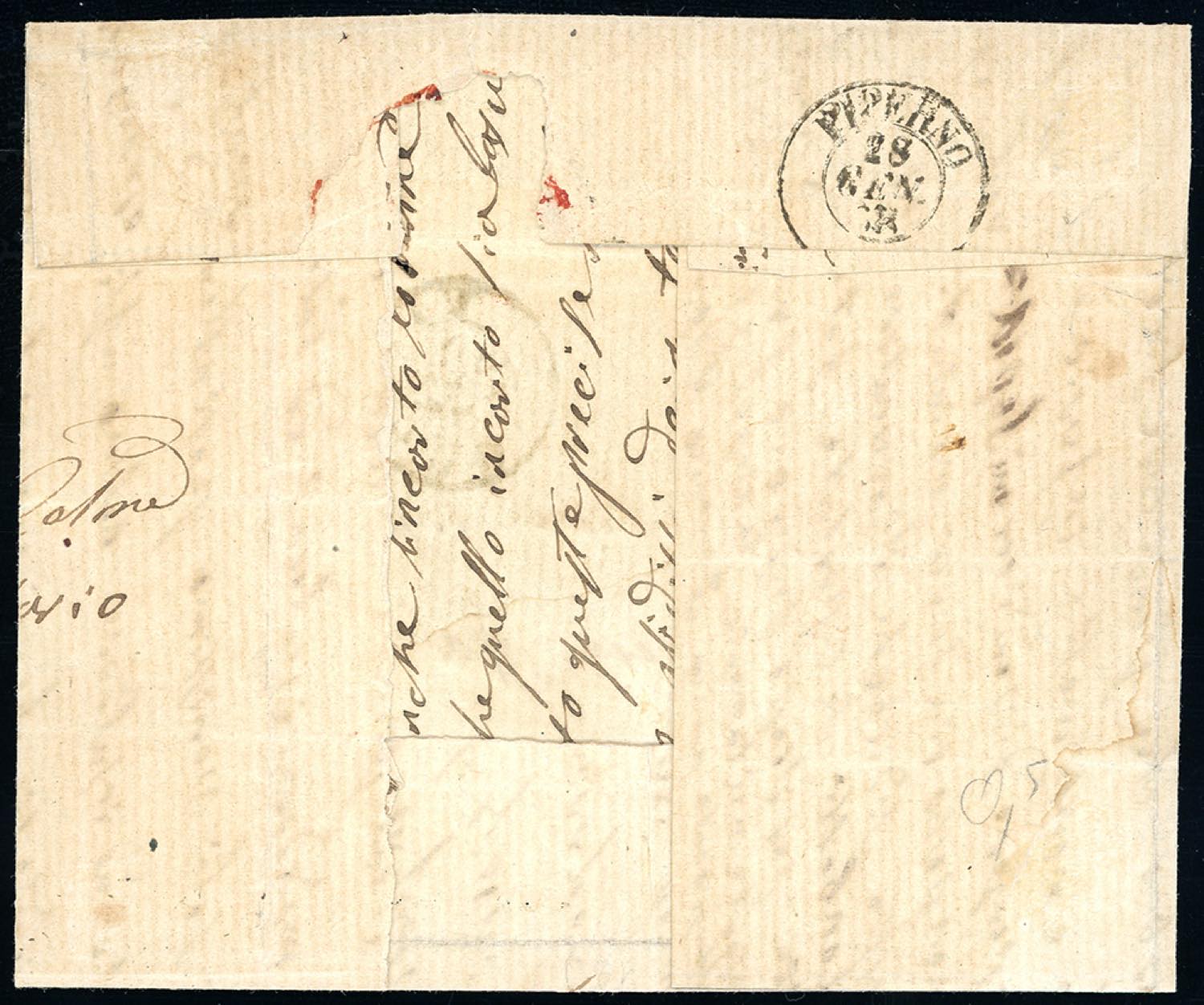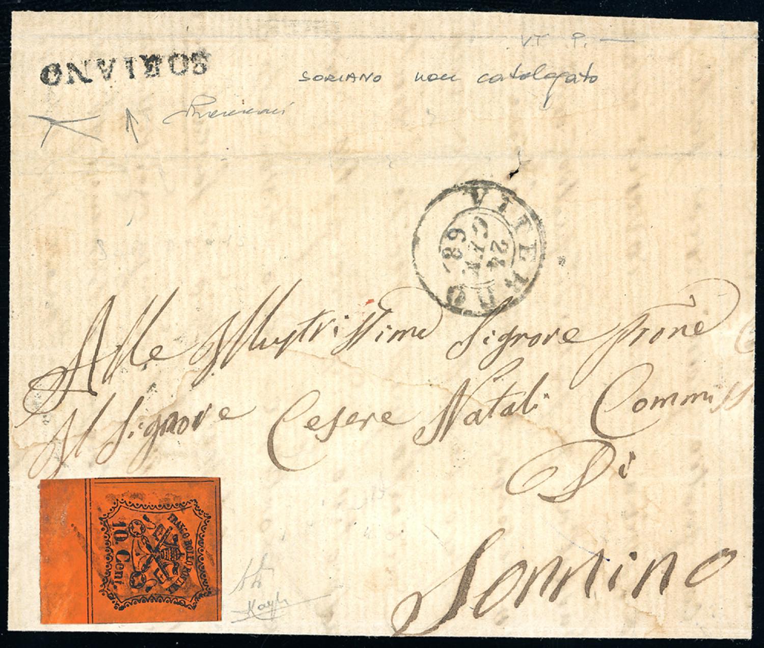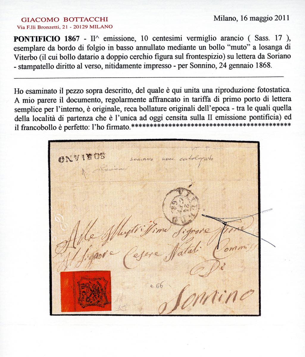 SORIANO, punti 12 - 10 cent. (17), bordo di foglio, su lettera del 24/1/1868, transito di Viterbo sul fronte, per Sannino. Pregevole bollo, specie impresso nitidamente. Vaccari, cert. Bottacchi.