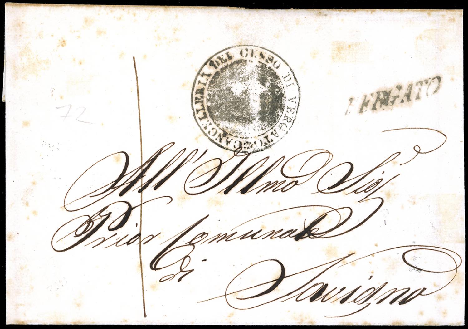 1859 - 2 baj verde oliva (3), frazionato diagonalmente al verso di lettera in porto asseganto da Vergato a Savigno, al verso transito di ... Leggi tutto
