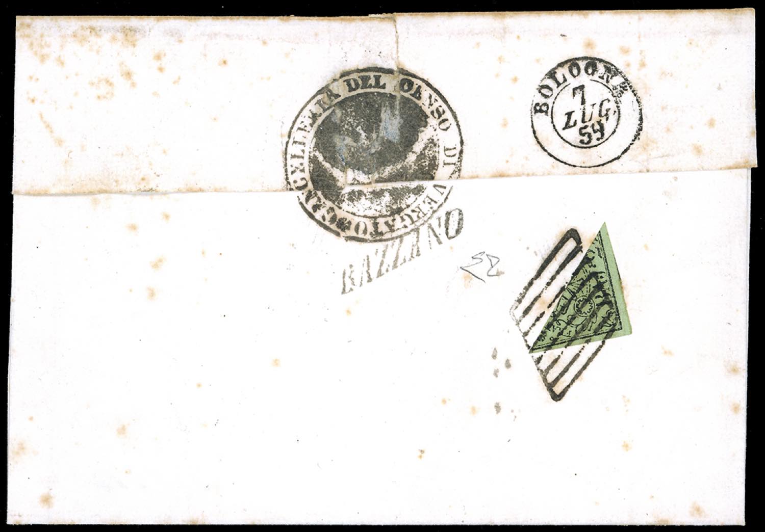 1859 - 2 baj verde oliva (3), frazionato diagonalmente al verso di lettera in porto asseganto da Vergato a Savigno, al verso transito di Bologna 7/7/1859 e lineare di Bazzano. Di pregio l'uso congiunto dei due stampatelli delle Distribuzioni di II classe sulla stessa lettera. Cert. E.Diena.