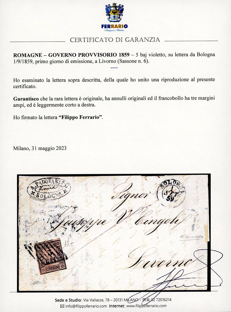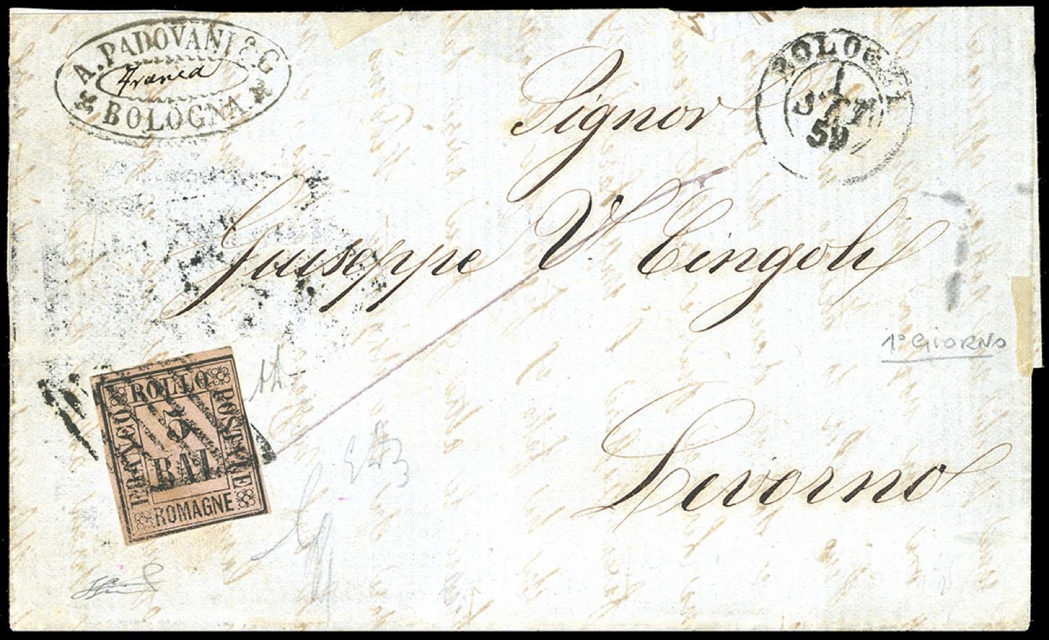 1859 - 5 baj violetto (6), margini da ampi a leggeremente intaccati, su lettera da Bologna 1/9/1859, PRIMO GIORNO D'EMISSIONE, a Livorno, in periodo di Governo Provvisorio di Toscana. Molto rara, poche lettere note. Emilio ed Alberto Diena, cert. Ferrario.
