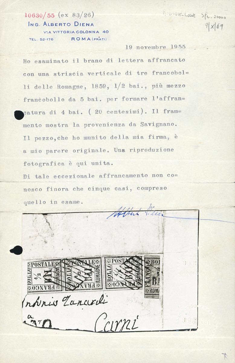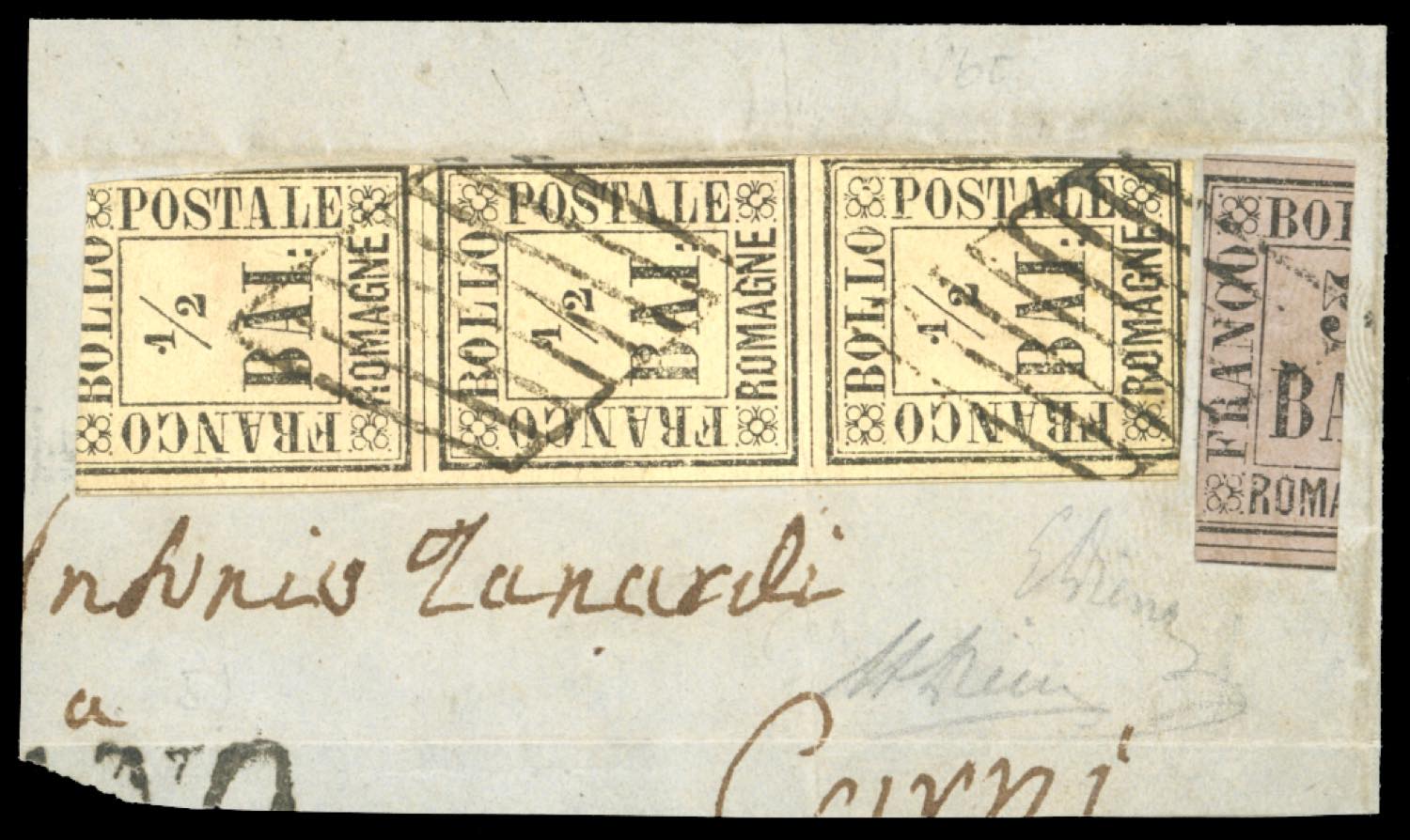 1859 - 5 baj violetto, frazionato verticalmente a metà, 1/2 baj giallo paglia, striscia verticale di 3 (6,1), difetti, usati su frammento da Savignano. Grande rarità dei frazionati di Romagne. Em.Diena e cert. storico Diena.