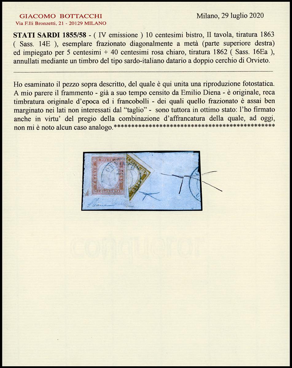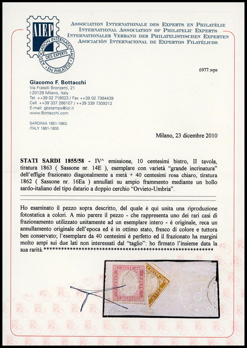 1863 - 10 cent. bistro, frazionato diagonalmente a metà, 40 cent. rosa chiaro (14E,16Ea), ottimo stato, usati su frammento ad Orvieto. Affrancatura rarissima, quotata dal catalogo Sassone € 420.000 su lettera. Em. e R.Diena, cert. Bottacchi.