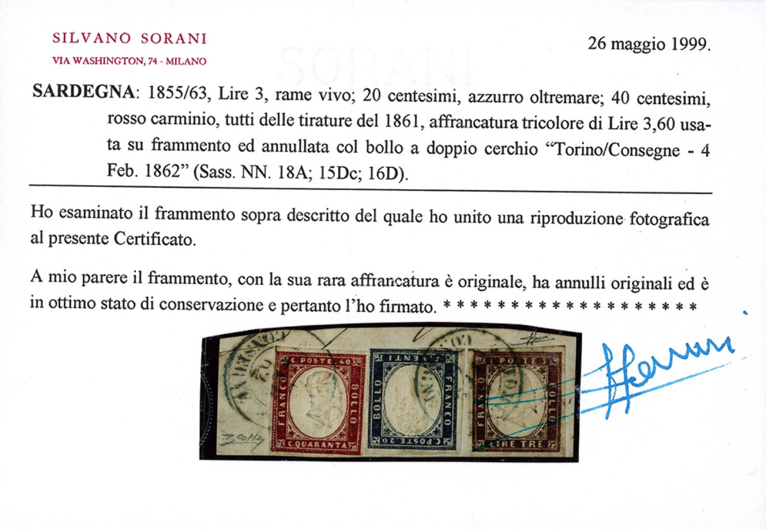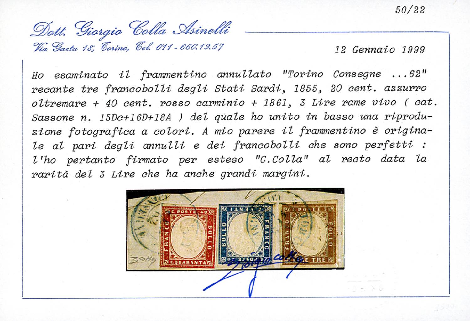 1861 - 3 lire rame vivo, ben marginato, 20 cent. azzurro oltremare, 40 cent. rosso carminio (18A,15Dc,16D), perfetti, usati su frammento a Torino 1862, datario azzurro. Rara e pregevole affrancatura tricolore, molto fresca. Em.Diena, Raybaudi, cert. Colla e Sorani.